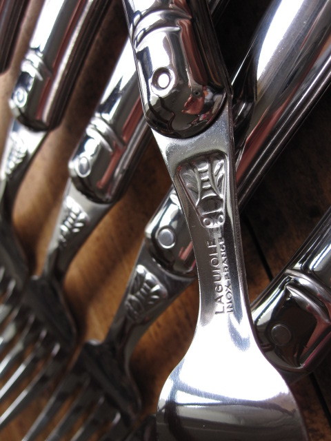 | フランス製Laguioleラギオールテーブルナイフとセットになるフォーク6本セットです。フランス製100%Jean Dubostの商品になります。長さ21.3cm重量60gステンレスの幅1.5mm(高級ラギオールと呼ばれるものはこの幅からになります)柄の部分もオールステンレス製。 ラギオールのシンボルマーク蜂が中央に型押しされており裏にはLaguioleの文字入り。フランス式のテーブルセッティングはフォークを裏に向けて置きますこれは貴族社会の名残で各家系により家紋が刻印されていた名残です。正真正銘のフランス製品ラギオール正規品です、現地価格で販売します。 | |||