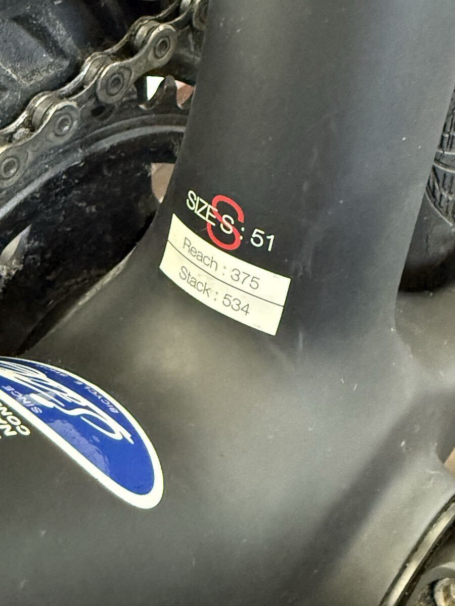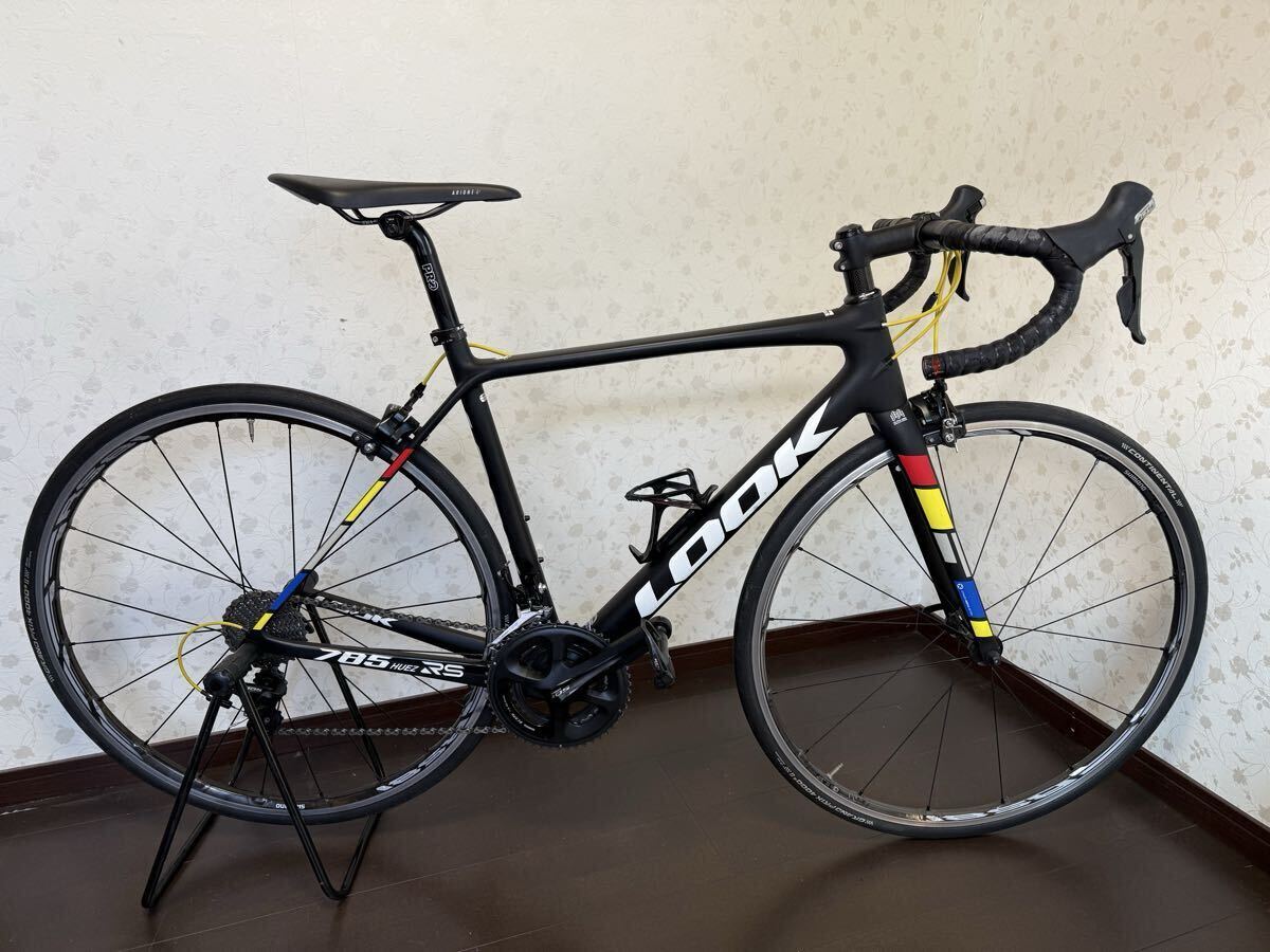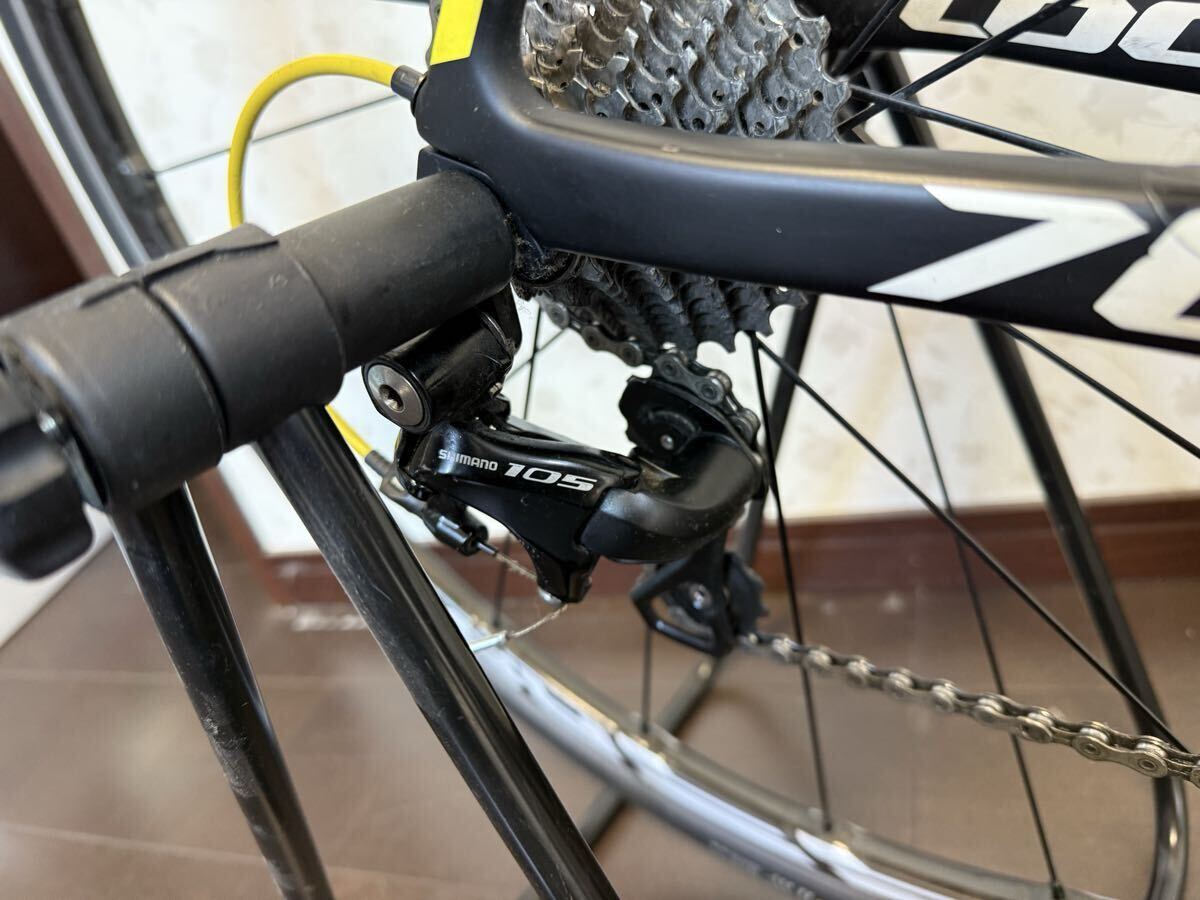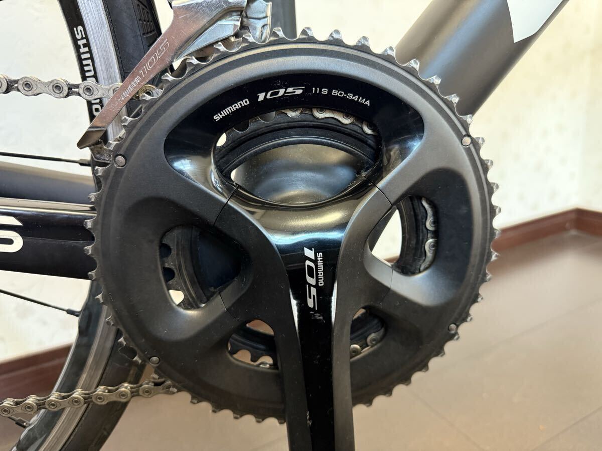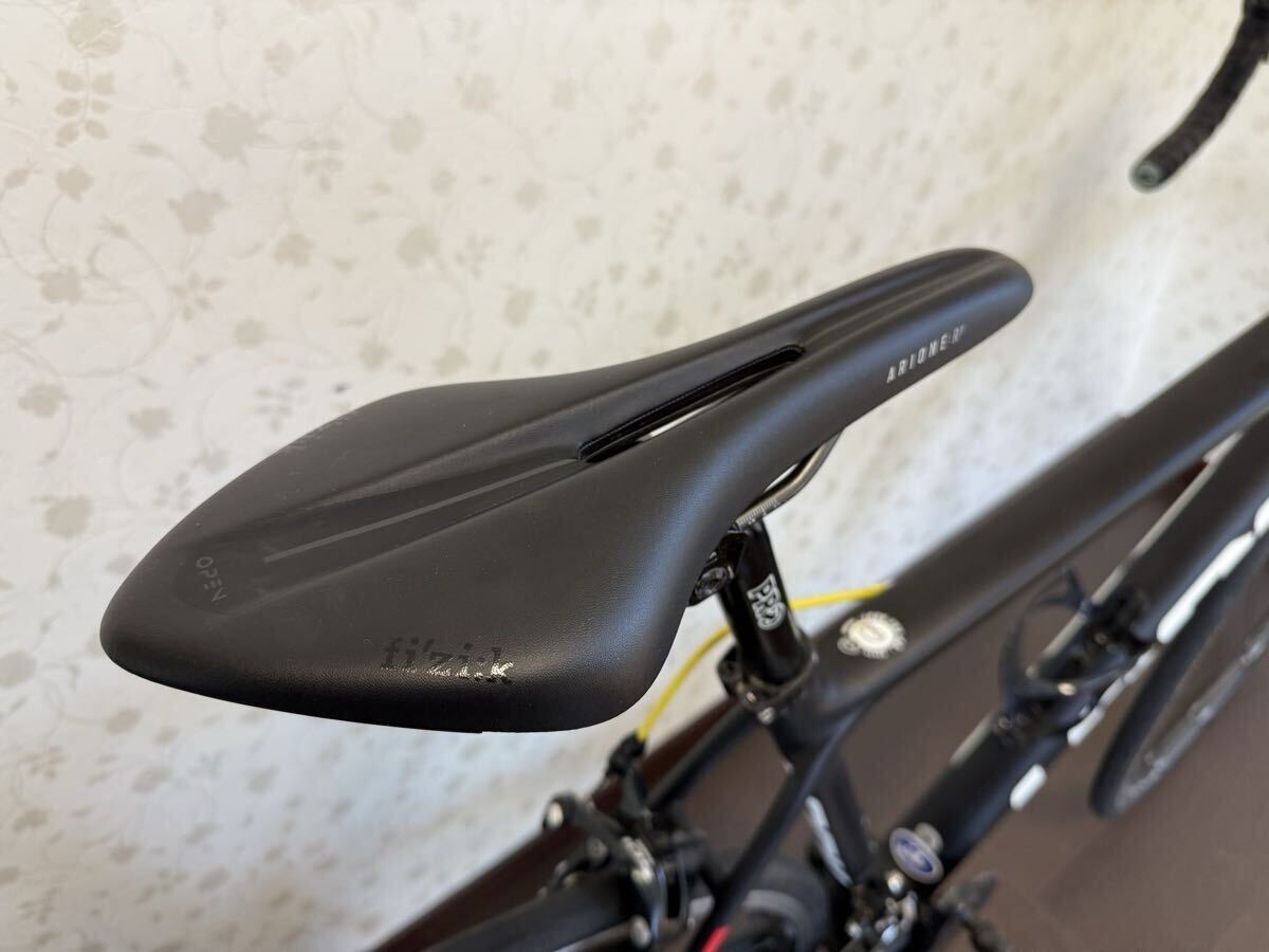 コンポはすべてシマノ の105でクランクはコンパクトクランクになっています。ホイールはシマノ のRS81、サドルはフィジークのアリオネ、ハンドルは380mmのアルミ製となります。