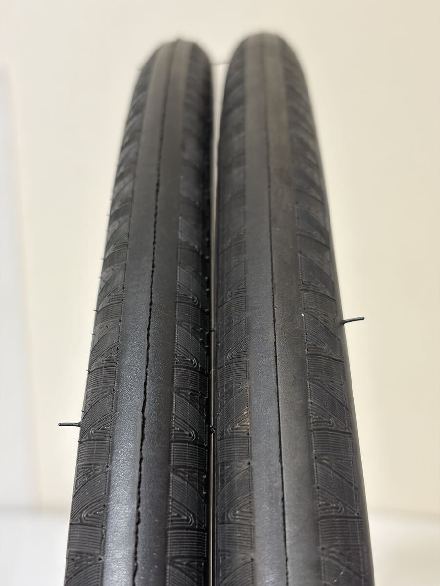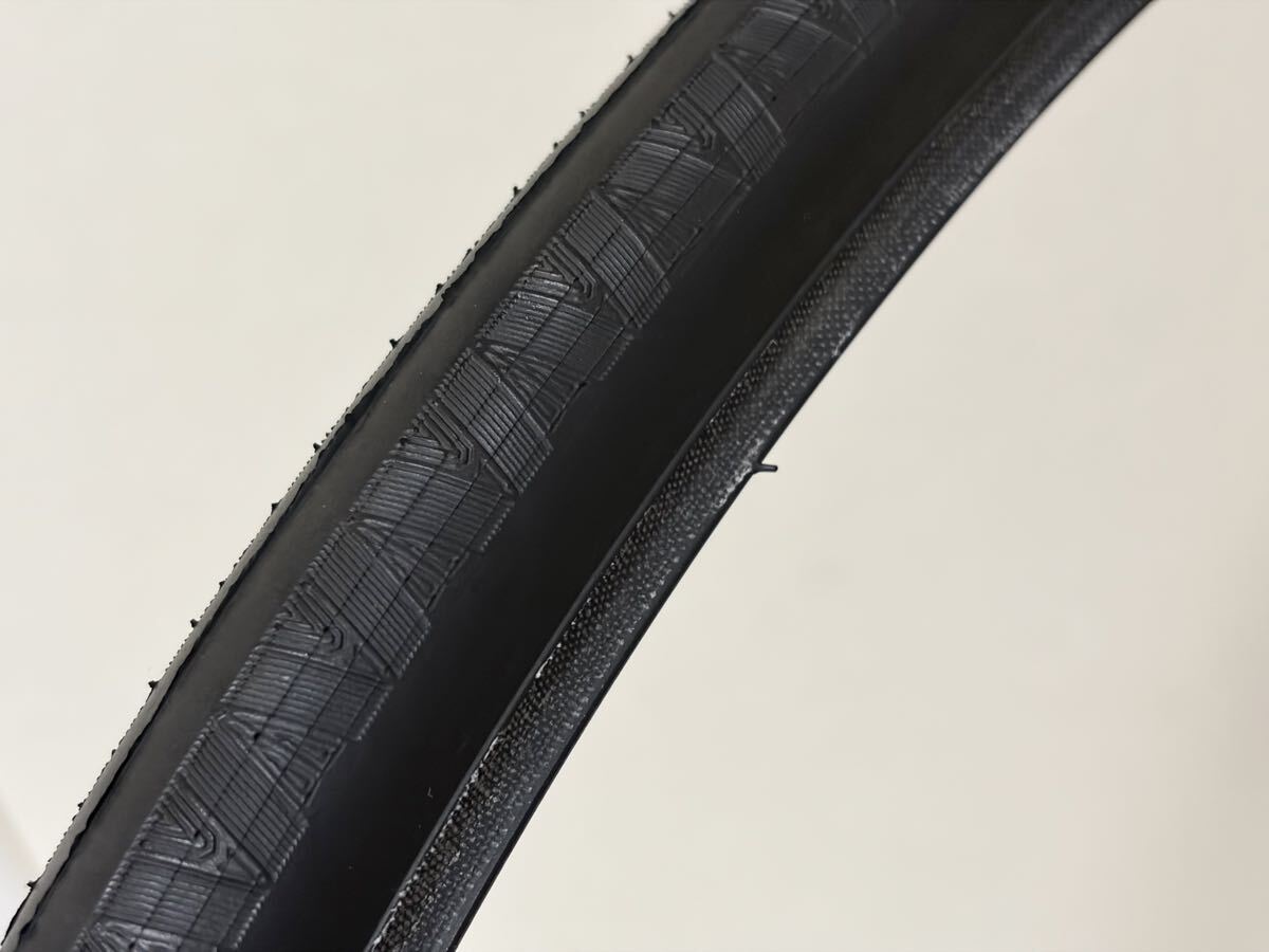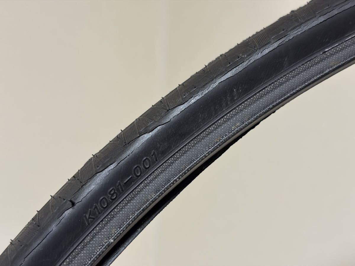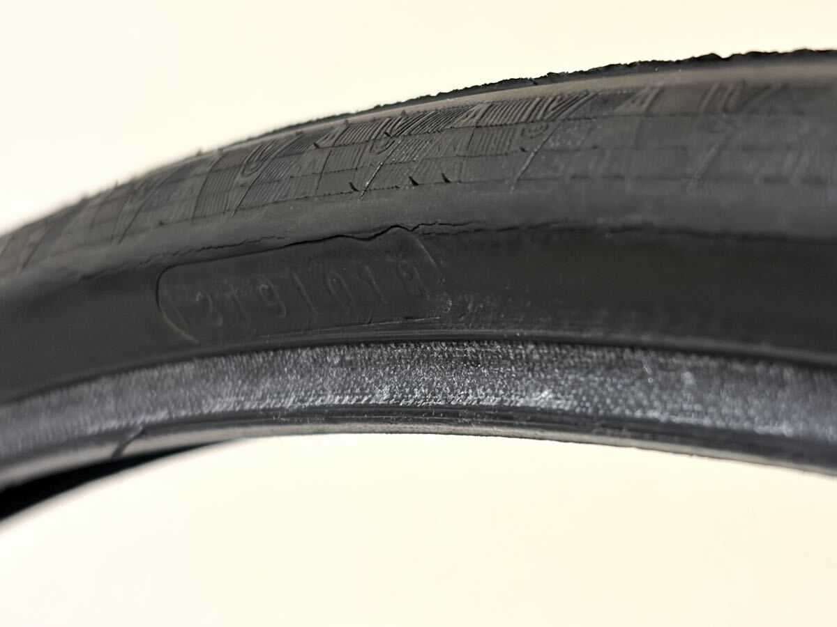 ・コンパウンドとサイドウォールの境目付近にひび割れしている箇所がございます。最大空気圧まで入れて数日様子を見ましたが問題なく、ケーシングに劣化やダメージはないため使用には問題ないかと思います。コンパウンド自体にひび割れはございません。