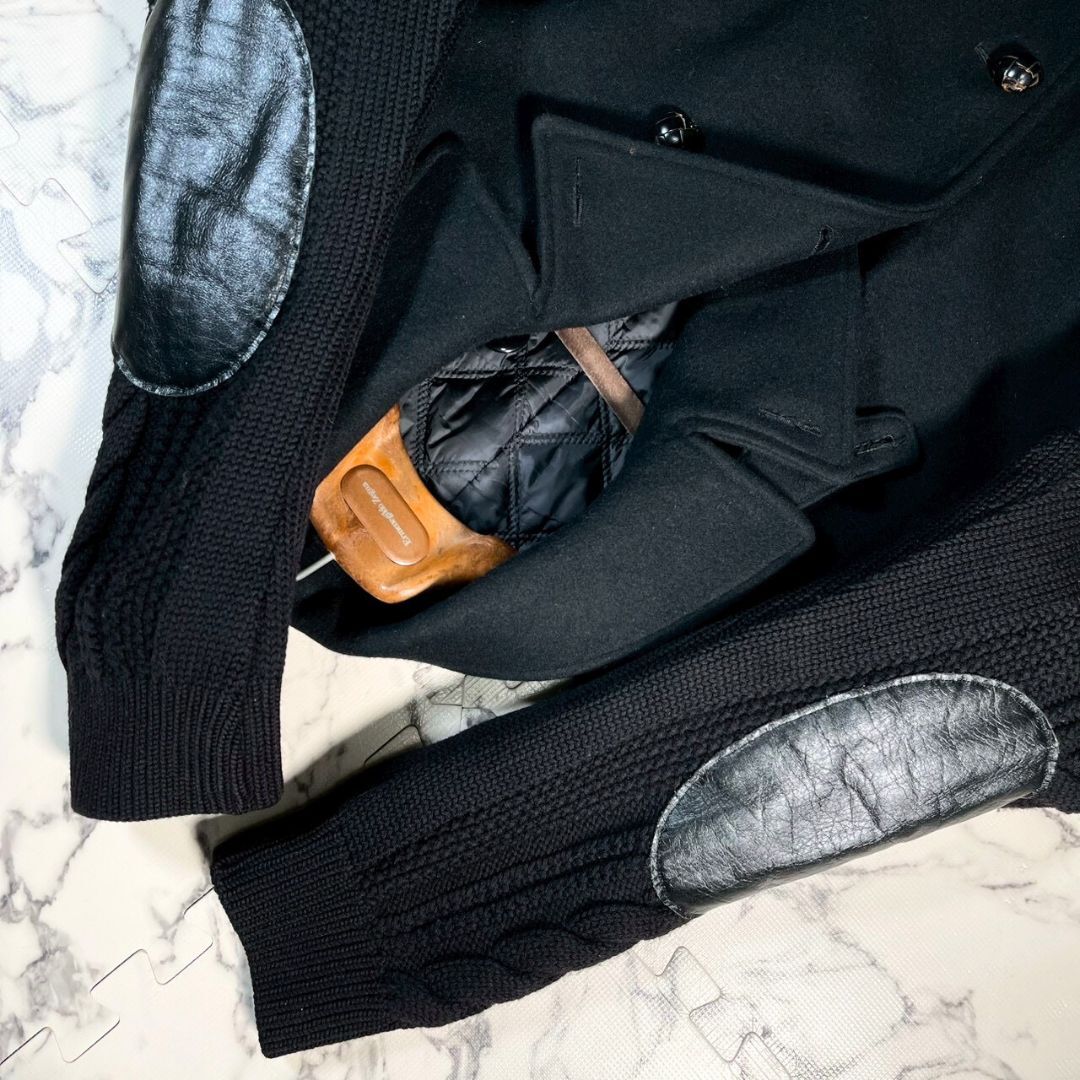 ウールをベースにしつつ、パネルごとに織りと質感を変えたニットの切替デザインは、シンプルでありながら目に触れた瞬間に“良いもの”だと感じさせる独特の深みがあります。ブラックの色調は落ち着きがありながら、光の角度によってわずかに表情を変え、素材そのものの温かみと滑らかさが際立ちます。アンゴラ混ならではのふくらみと軽さは、羽織ったときの肩への負担を感じさせず、上質な空気がふわりと纏える魅力があります。