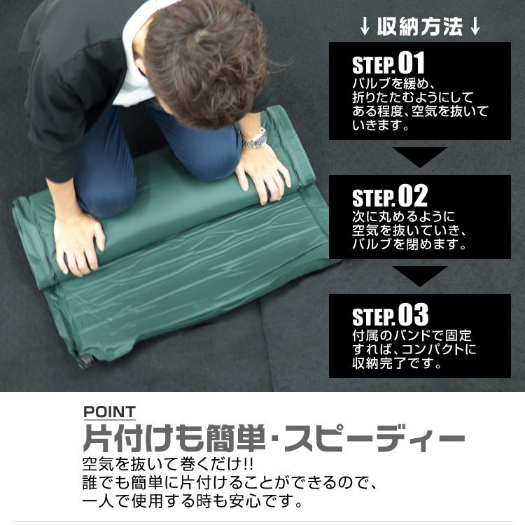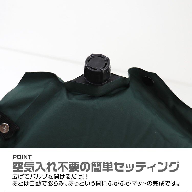 マット上部のバルブを開けば、それだけでマットが自動で膨らむので簡単に設置することができます。 厚さは10cmもあるため快適性は抜群で軽量です。 長時間寝ても疲れにくい高反発ウレタンだから快適に眠ることができます。 収納袋、収納バンドがついてくるから、簡単にコンパクトできます。 アウトドア・キャンプでの使用にはもちろん、ツーリング、車中宿泊などさまざまなシーンでご利用いただけます。 軽量・コンパクトなので地震や災害時の防災用品としてもオススメです。 【商品仕様】 内容:本体×1・収納袋×1 カラー:グリーン サイズ:(約)縦198cm×横65cm×厚さ10cm 収納サイズ(約):65cm×30cm 重量(約):3kg 【注意事項】 ※膨らみが足りない時は直接息を吹き込んで空気を入れてください。 ※膨らませすぎるとエアマットが破損する可能性がございますのでご注意ください。 |