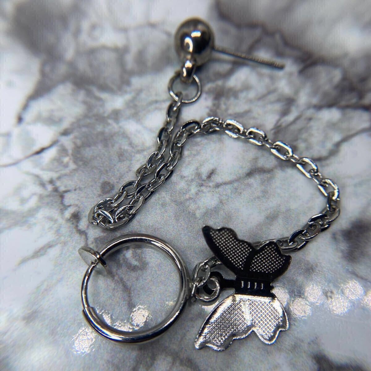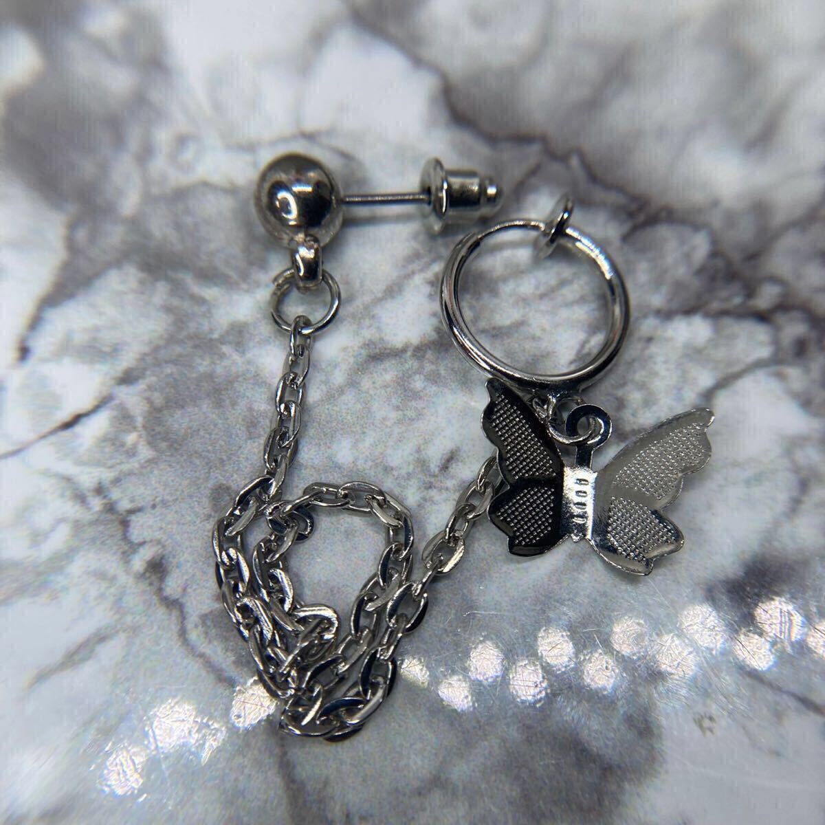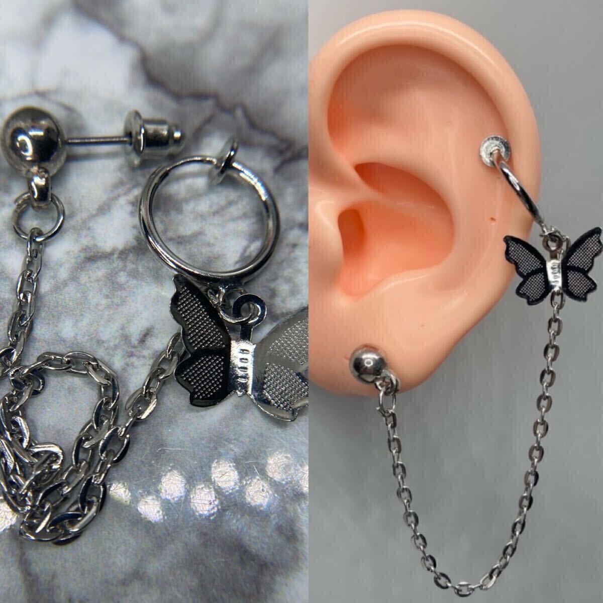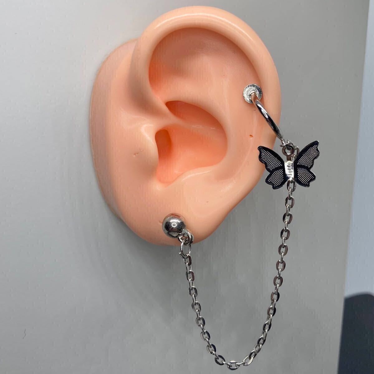 【新品】スタッド ピアス 18g バタフライ ボール 連結 チェーン イヤーカフ シルバー 片耳 フープ フェイクピアス イヤリング 韓国
