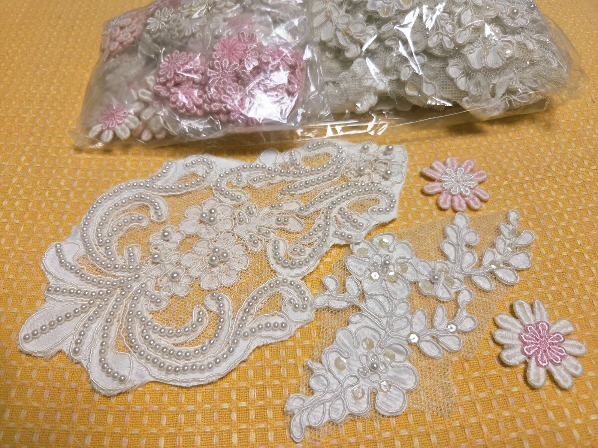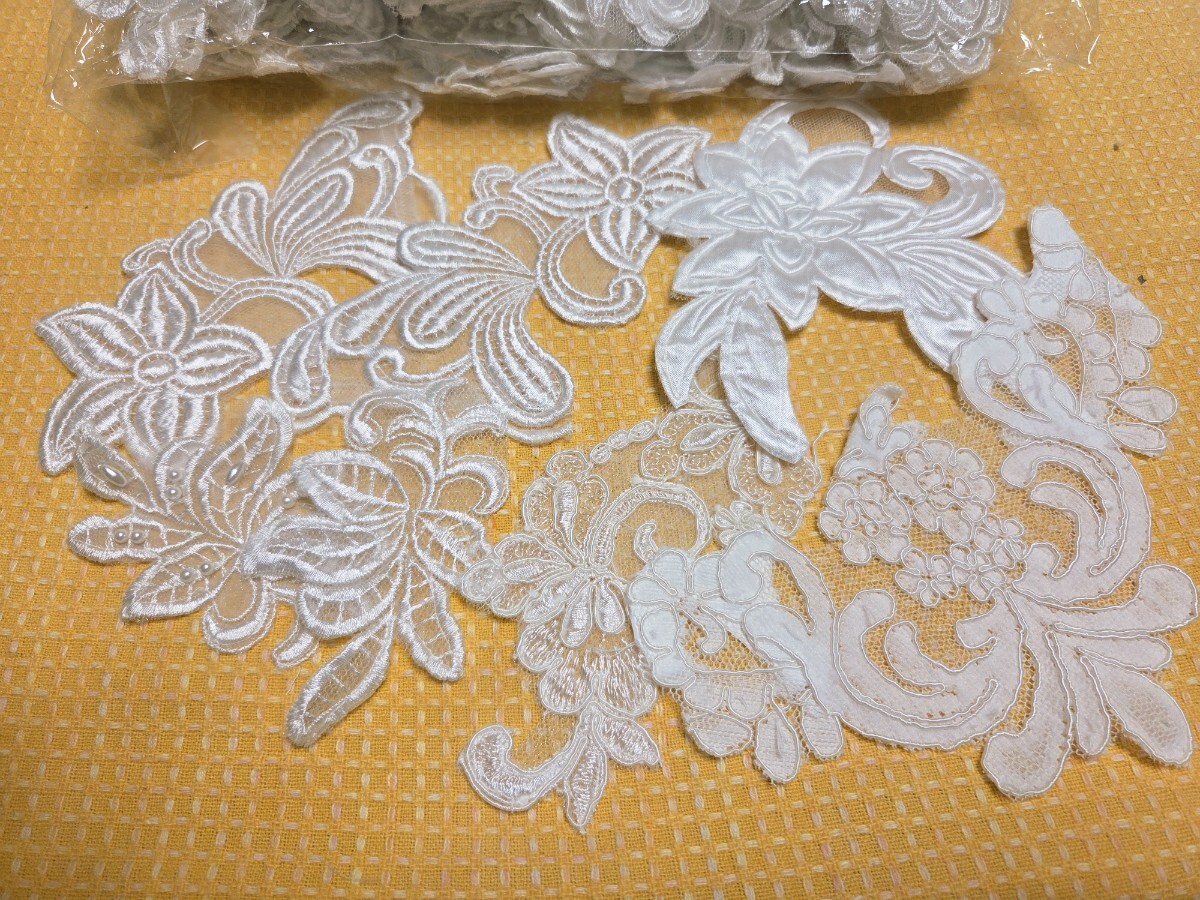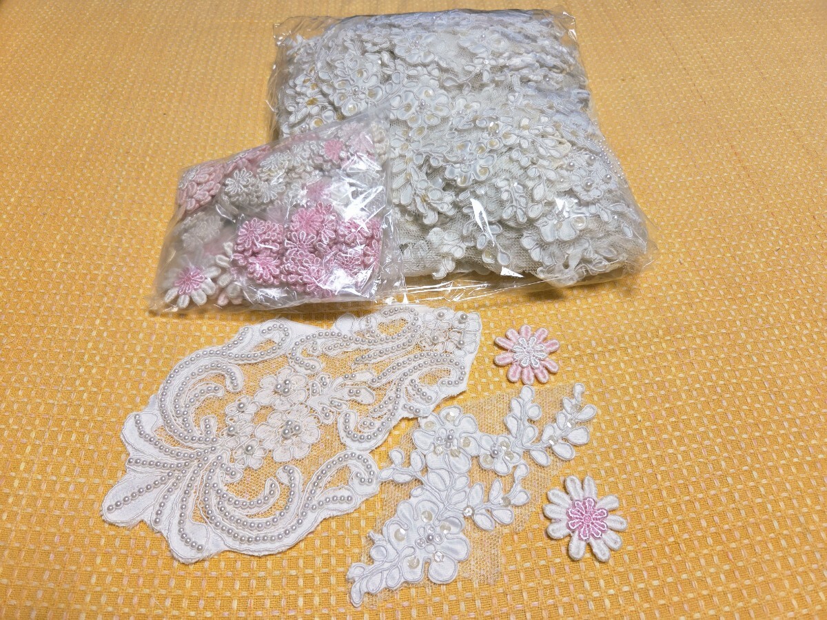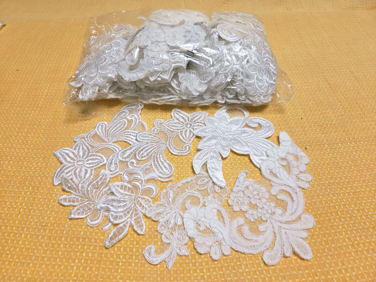こちらの商品はリメイク材料にいかがでしょうか?中古のウェディングドレスを解体して材料にするために モチーフをいただきました。モチーフの総重量は1.1kgです。中古のウェディングドレスはクリーニングは済んでおりますが、画像の一番最後の2枚にシミと黒い汚れがあるのを発見いたしました。 もしかしたら他のところにもあるかもしれませんが比較的綺麗だと思います。 デザインなどは画像をよくご覧になり、ご理解の いただける方のご入札をお待ちいたしております。