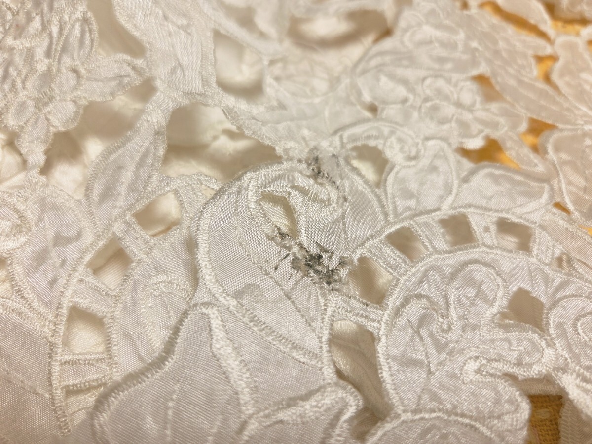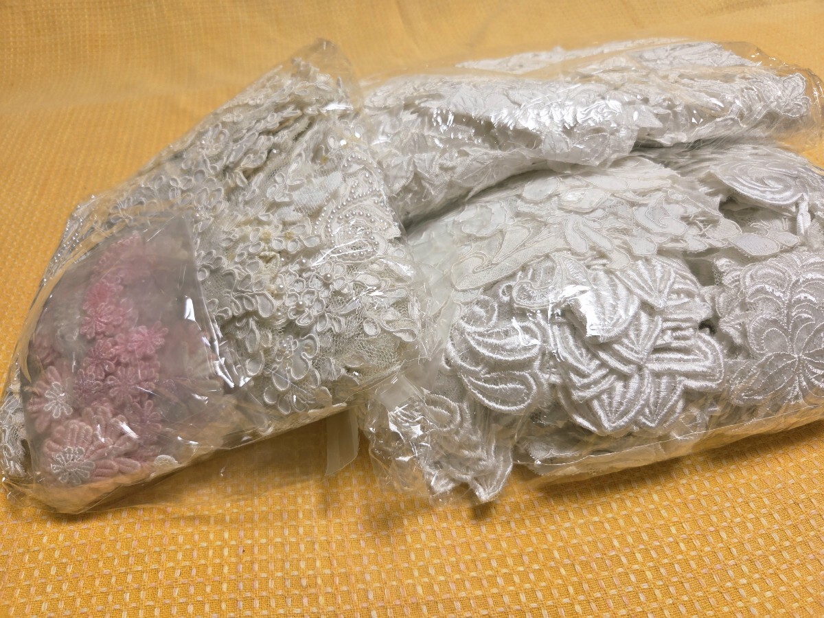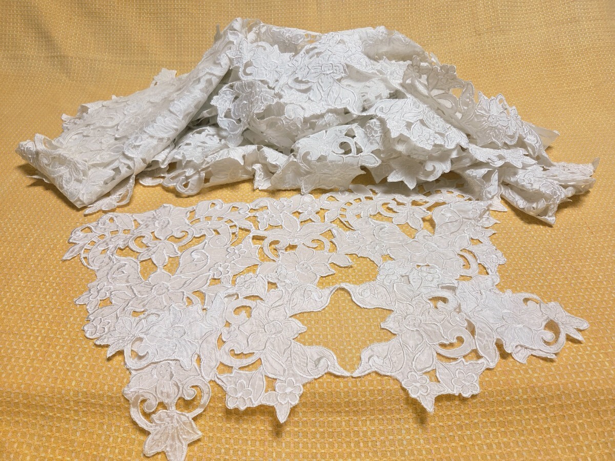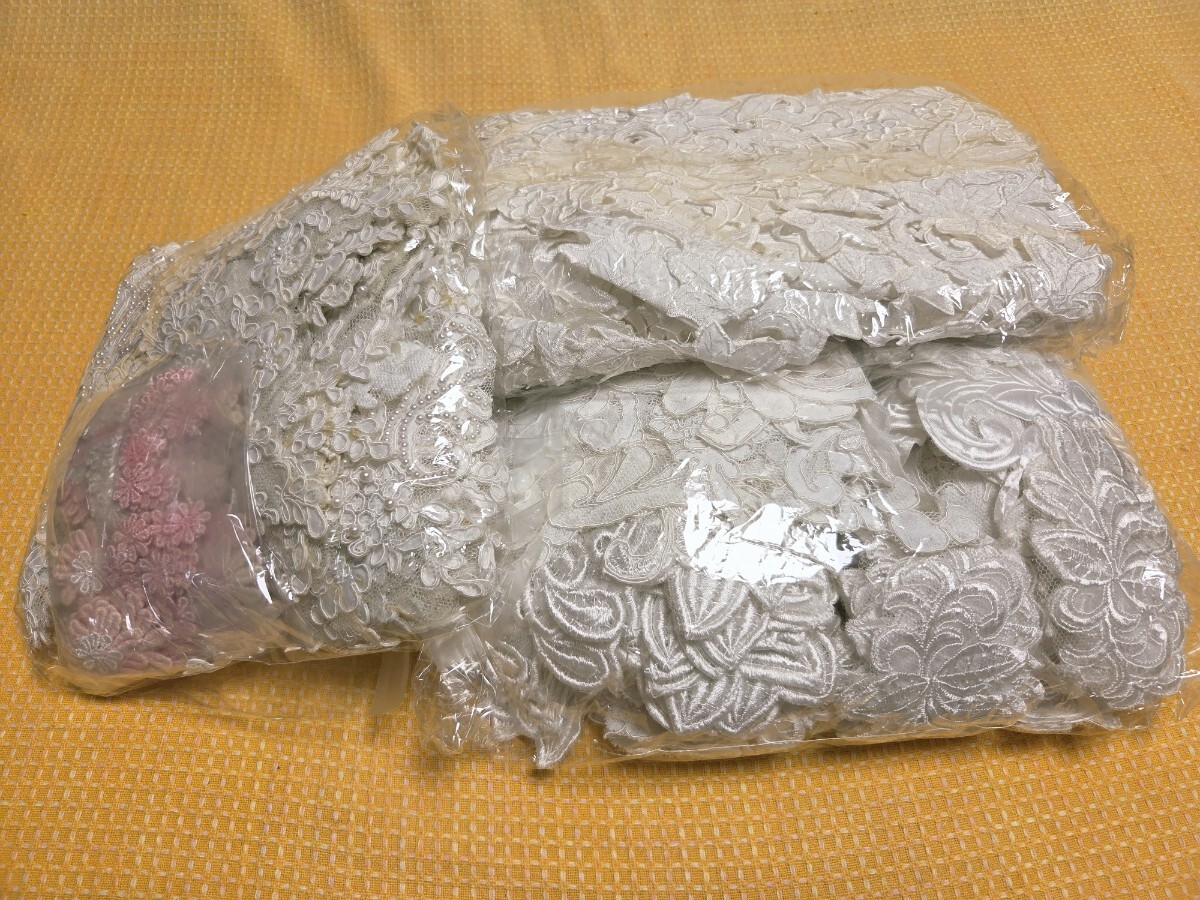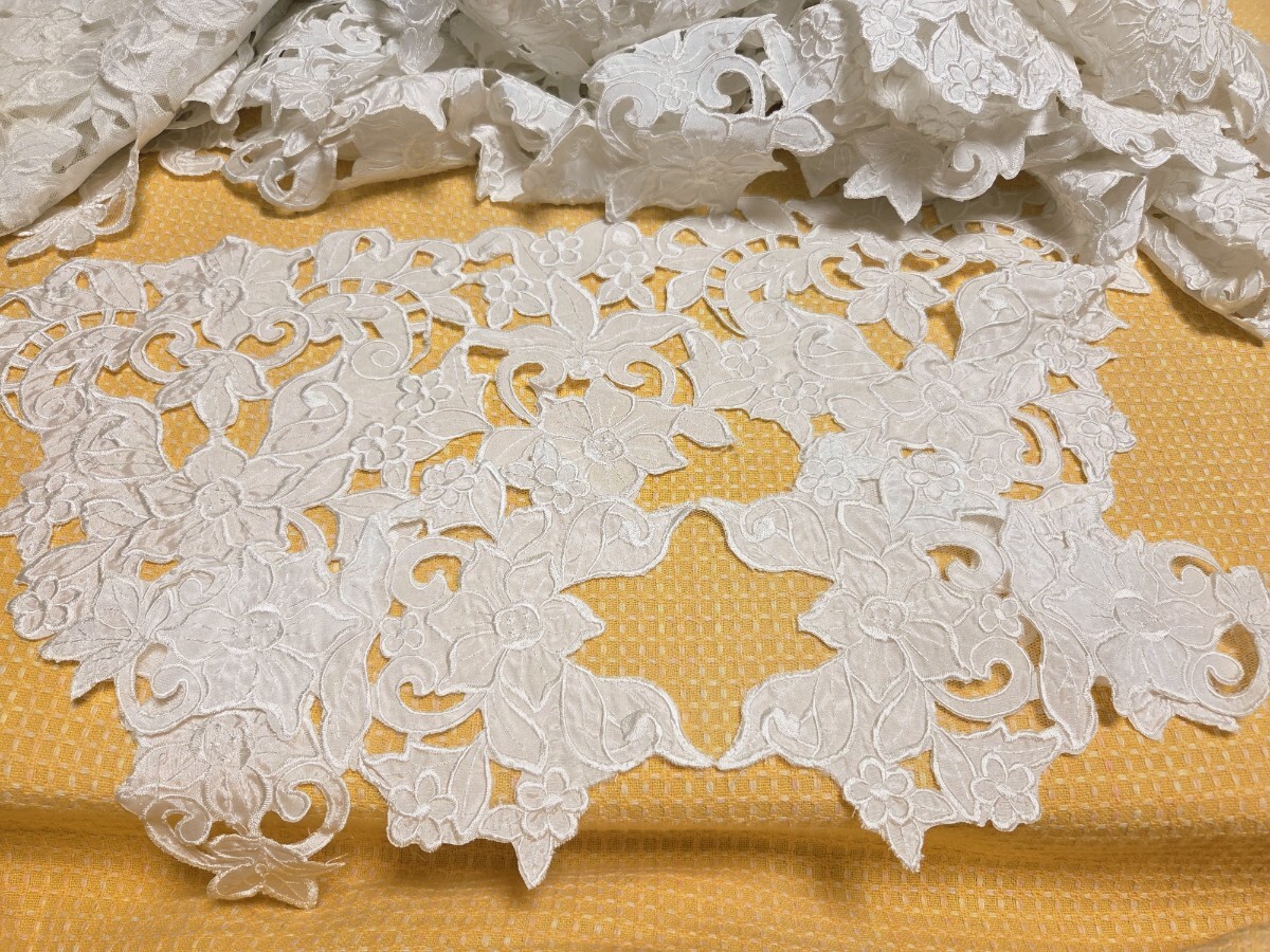 こちらの商品はリメイク材料にいかがでしょうか?中古のウェディングドレスを解体して材料にするために モチーフをいただきました。モチーフの総重量は1.1kgです。中古のウェディングドレスはクリーニングは済んでおりますが、画像の一番最後の2枚にシミと黒い汚れがあるのを発見いたしました。 もしかしたら他のところにもあるかもしれませんが比較的綺麗だと思います。 デザインなどは画像をよくご覧になり、ご理解の いただける方のご入札をお待ちいたしております。
