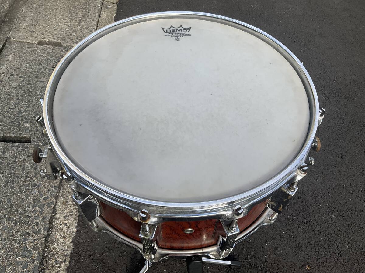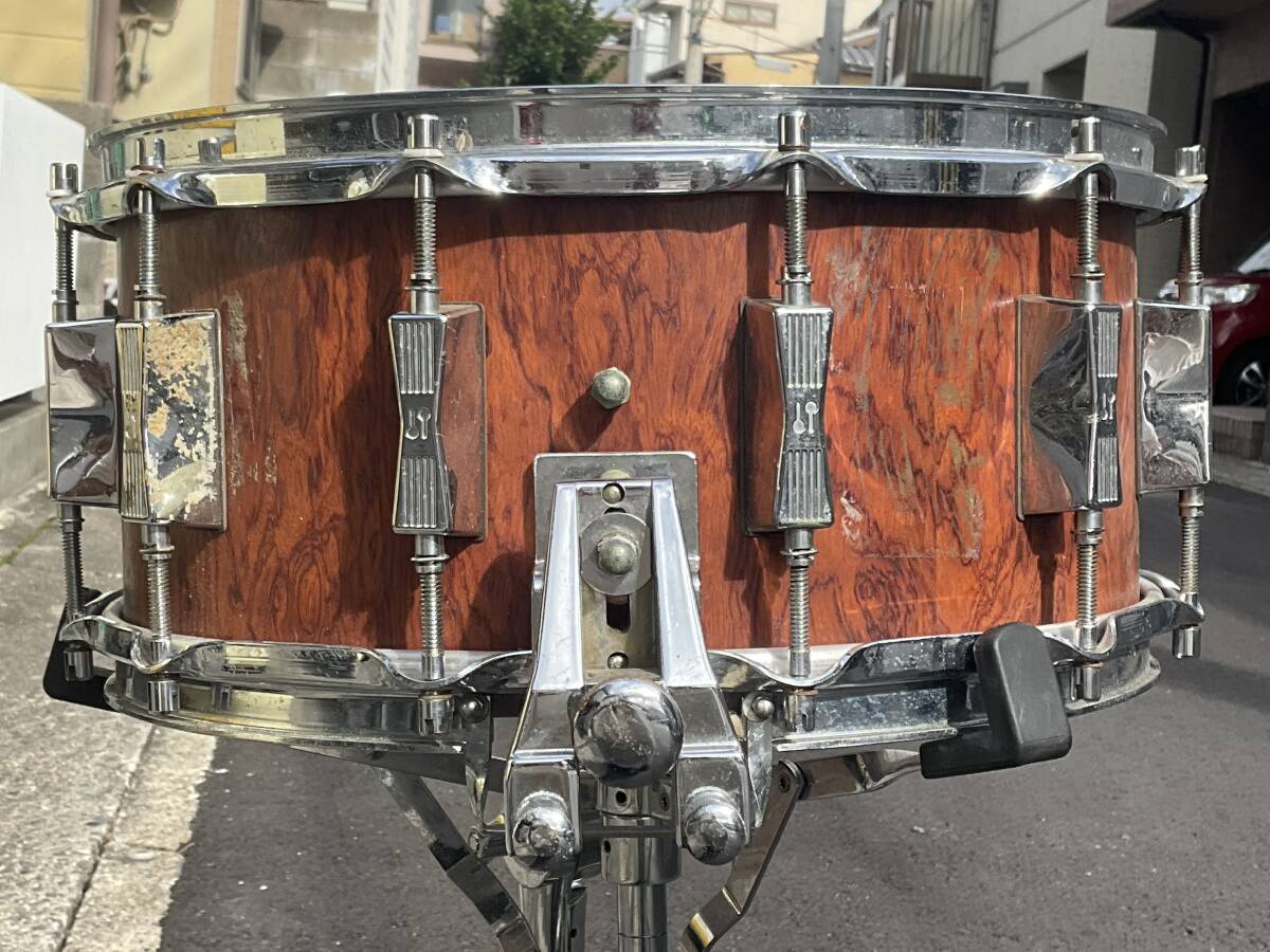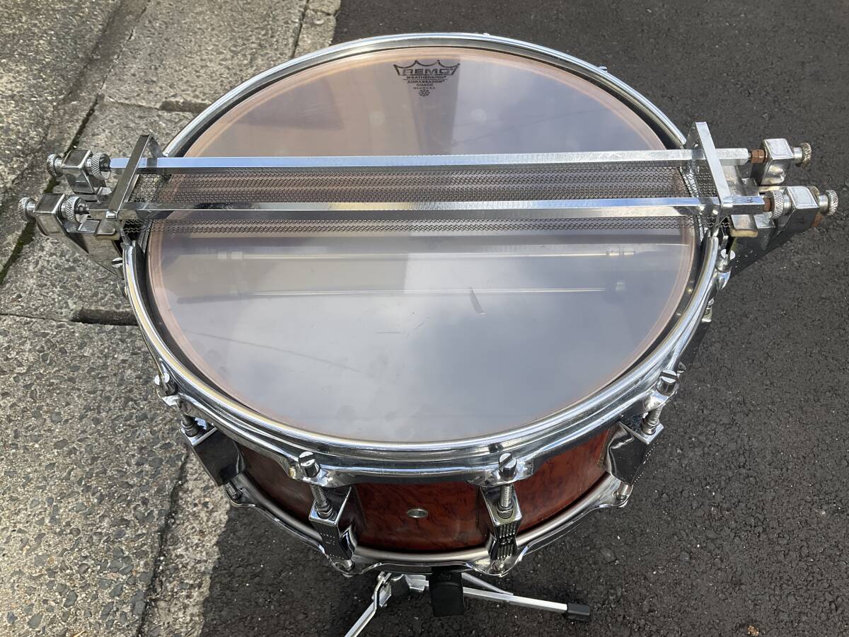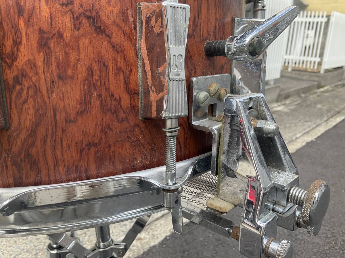 ご覧の様に、スレ、ビッツ、錆、テープ跡、スナッピーガイドのボルト一個が非純正に交換(ストレイナー操作は問題無し)、スナッピーワイヤー3本欠け、がございます。(傷や欠け、割れはありません)。出品者はバブル期のソナースネアをほぼ全機種演奏しましたが、(ドラムは作りと素材が同じであれば総重量が軽い方が物理的によく振動しますので)  この、プレスリム、で浅い胴6.5の、シェル厚約6mmのモデルが段違いに良く鳴ると感じます。特にハイピッチでの鐘の音の様なサスティーンは他の重いモデルからは得られません。現在厚めのヘッドが貼ってありますので、コーテッドアンバサダーへの貼り替えを強くお勧めします。80年極初期にしか作られなかったこのライトウエイトモデルはオークションにもネット全体にもほぼ出て来ません。音質や操作の問題は何もありませんので、気になる方は外観のみクリーニングなさって、どうぞこの世界遺産をご堪能ください。宜しくお願いいたします。(スタンドは付属しません 補償のある便で送ります)