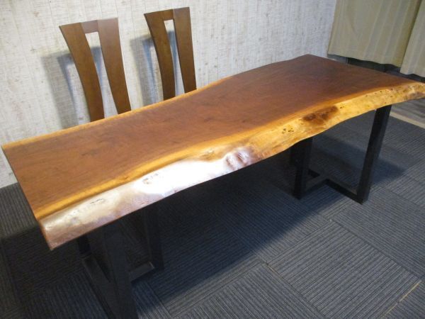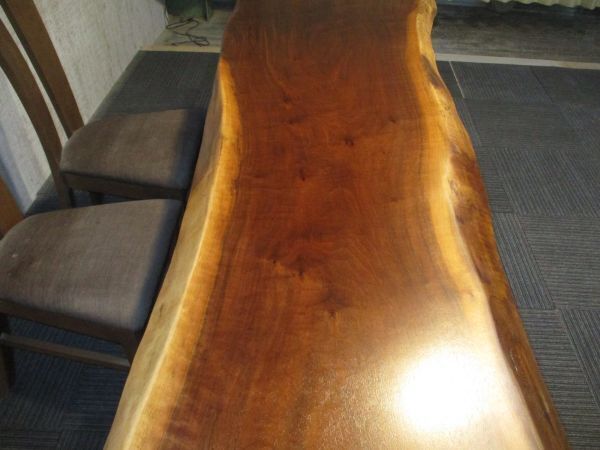 ウォールナットの一枚板無垢のテーブルです。長さは、ご希望のサイズにカットできます。現状は、まだ下地塗装の状態です。これから最終仕上げに入ります。よりきれいになります。