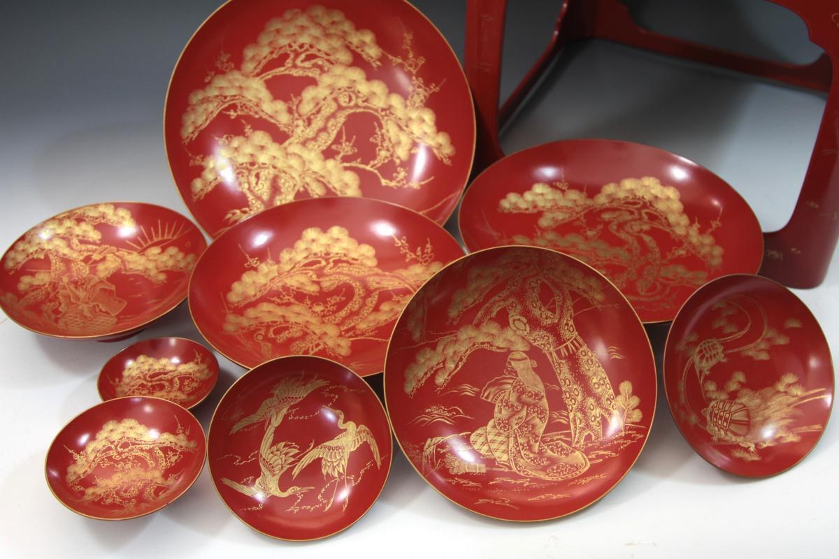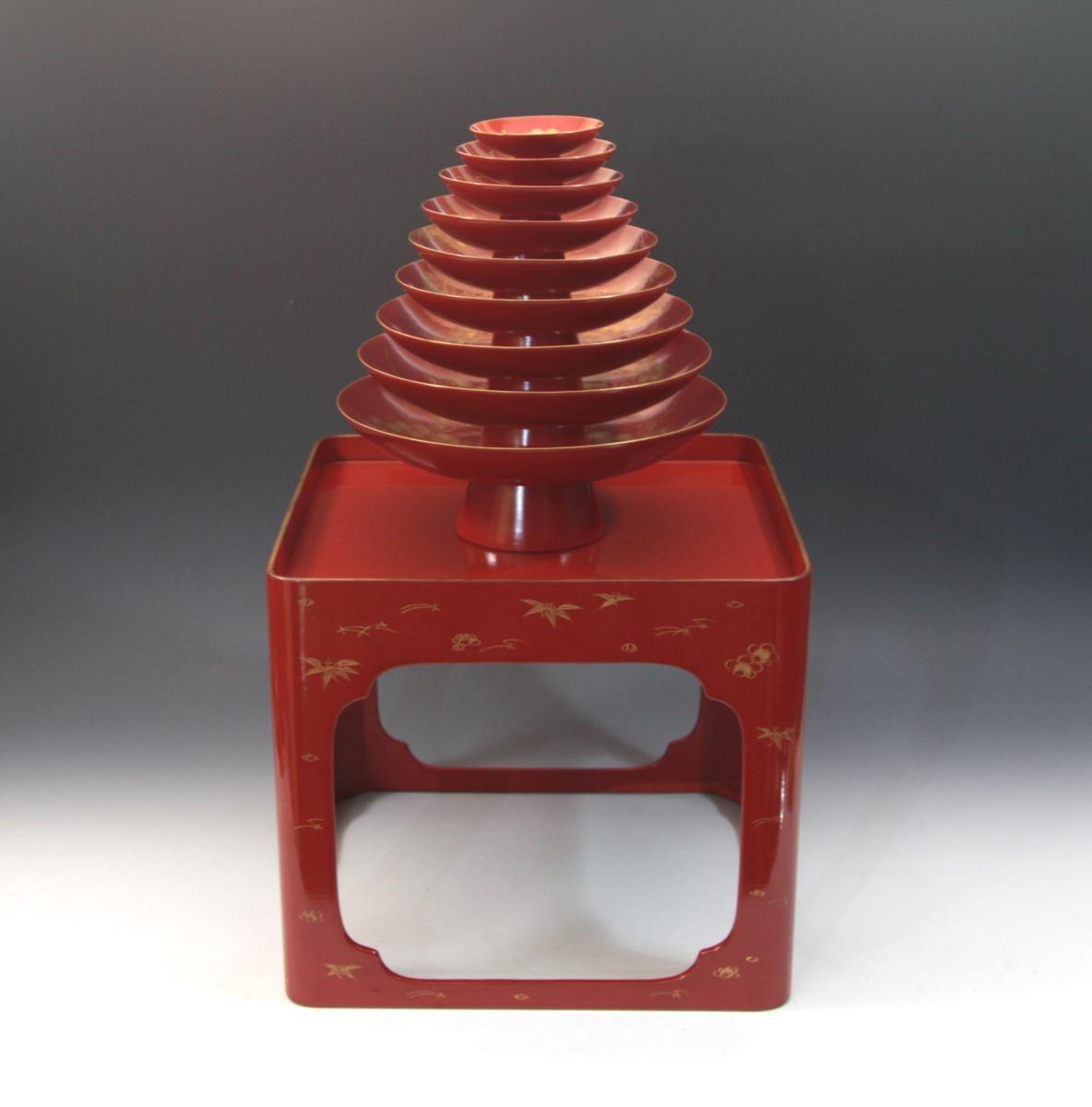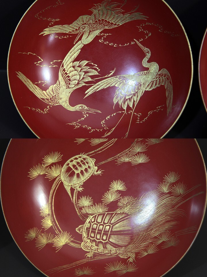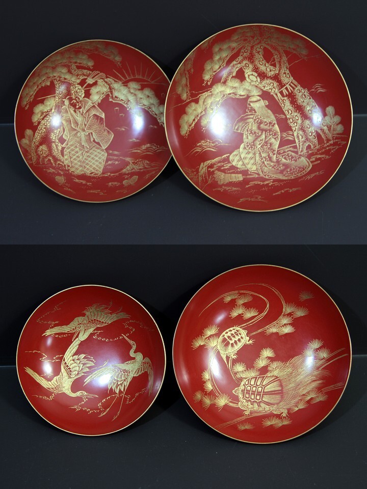★★★ 明治期 木製 沈金彫り 松竹梅 高砂 鶴亀彫り 九つ盃 ★★★