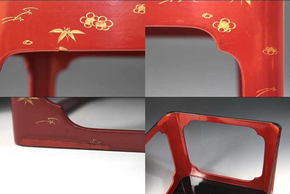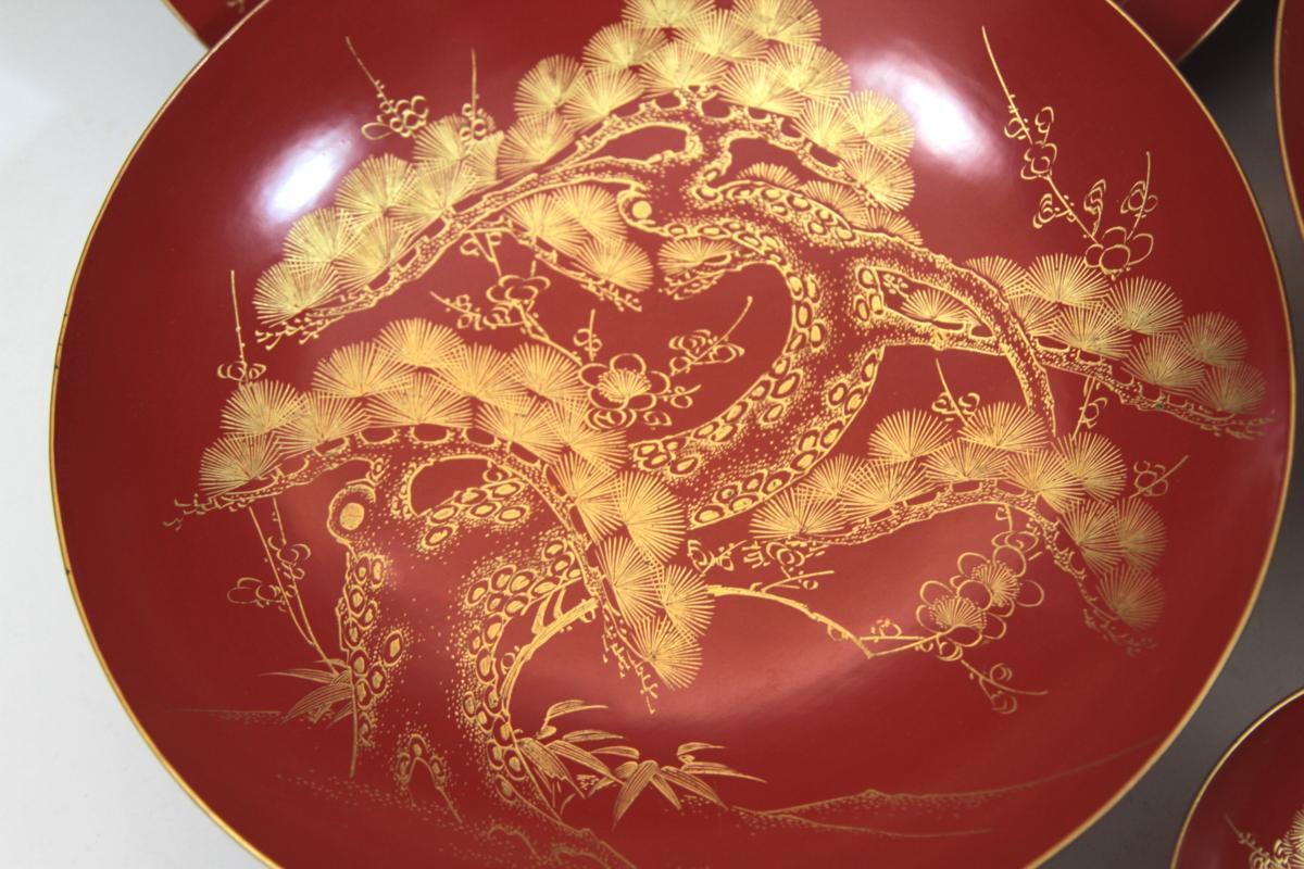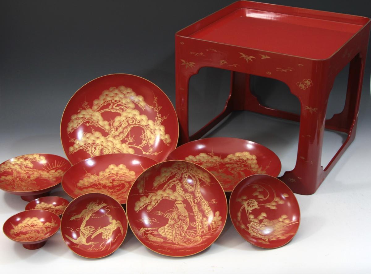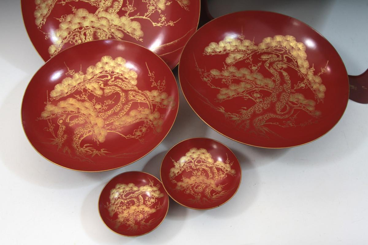 ★★★ 明治期 木製 沈金彫り 松竹梅 高砂 鶴亀彫り 九つ盃 ★★★