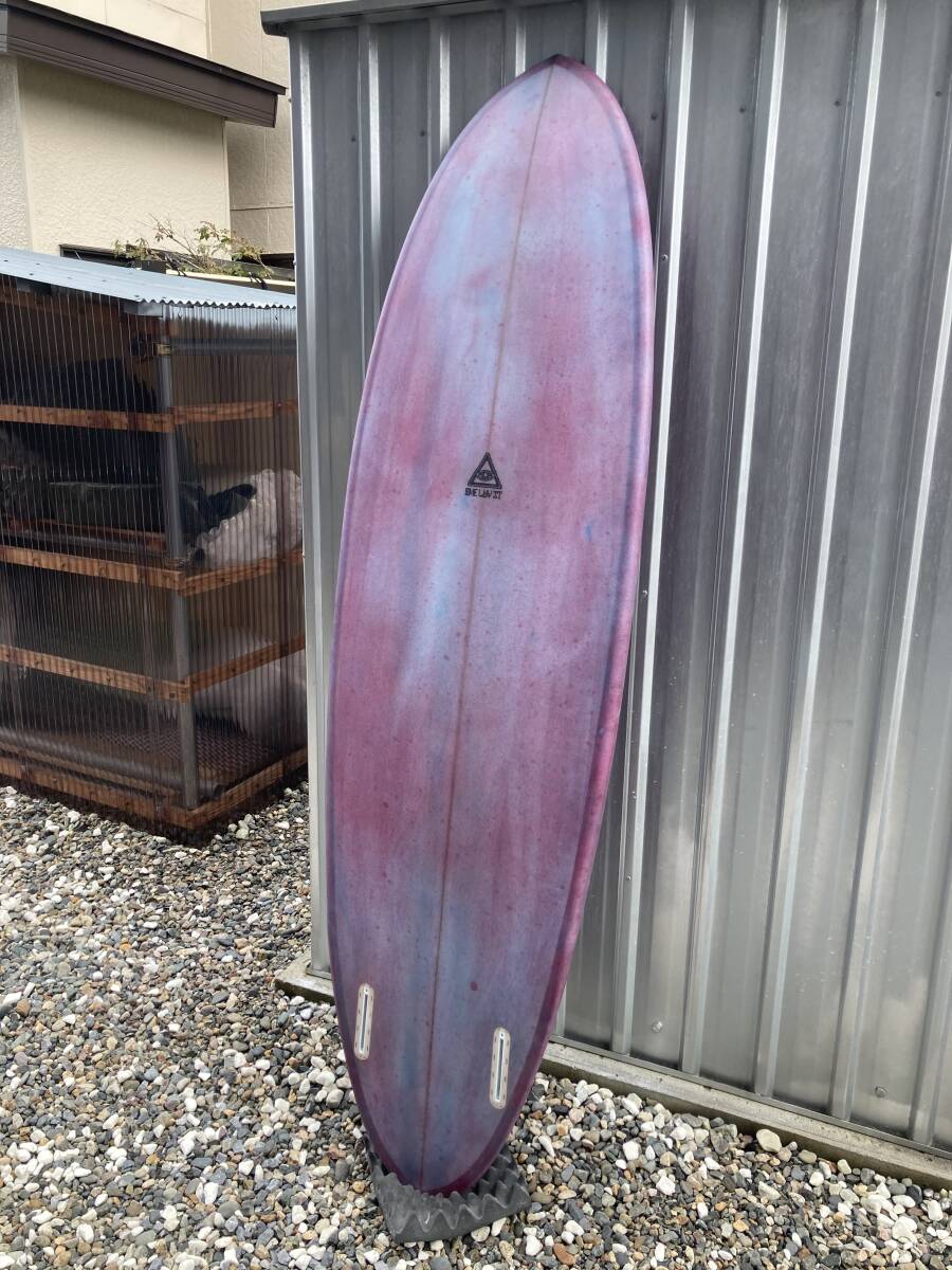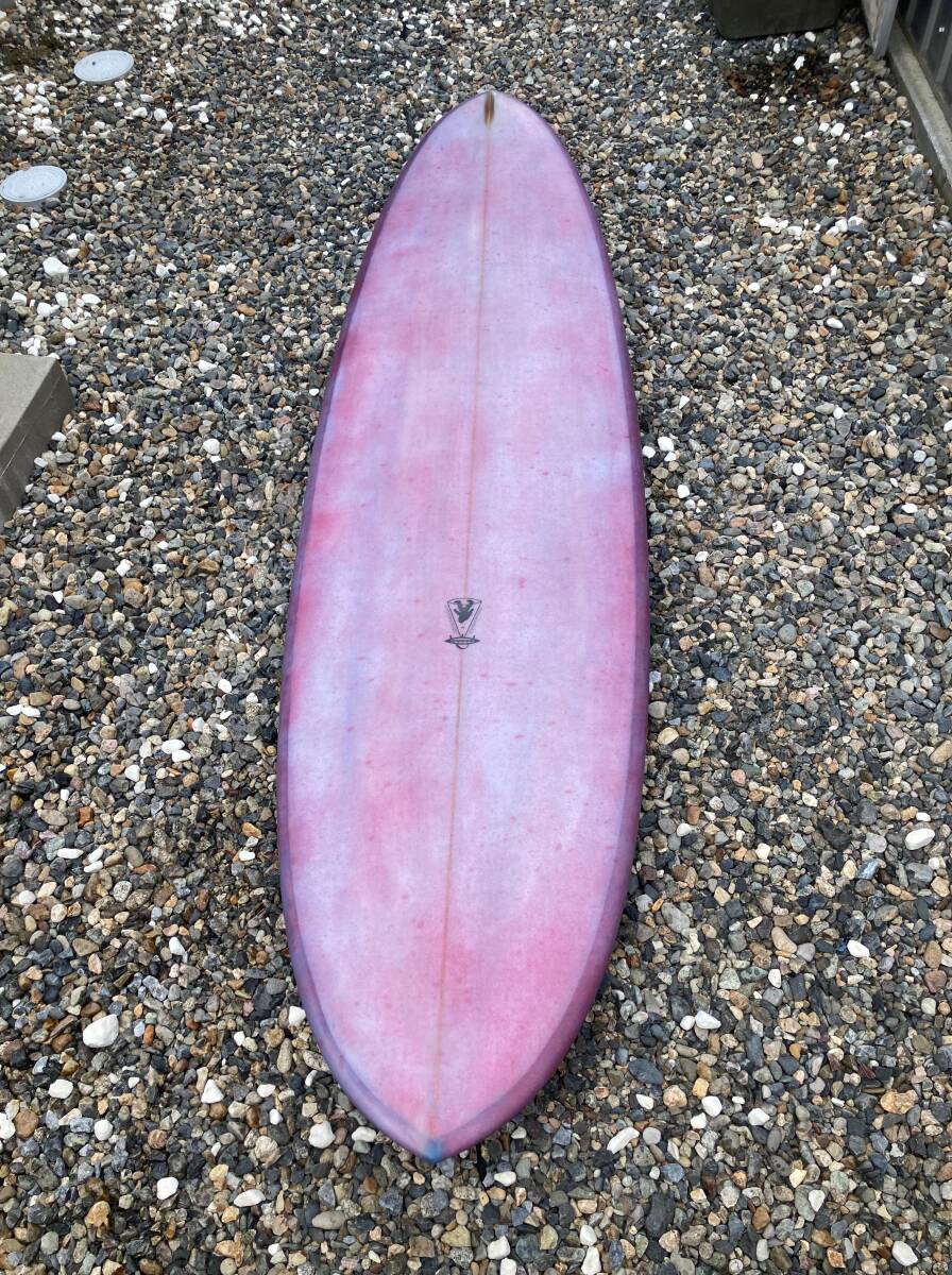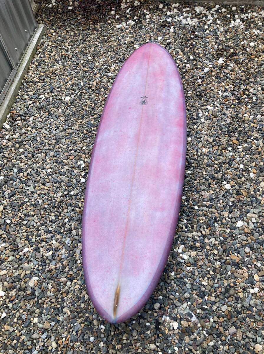 ボリュームがあるツインピンのミッドレングスです。レールはミディアムボキシー、ロッカーは程よくつけてあります。コンケーブはシングルの中にダブルが入っています。サイズ以上に軽快に動いてくれます。
