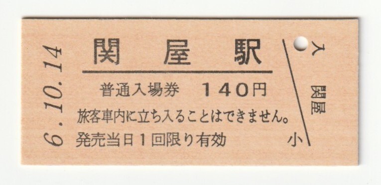 平成6年10月14日 越後線 関屋駅 140円硬券普通入場券(日付印刷)
