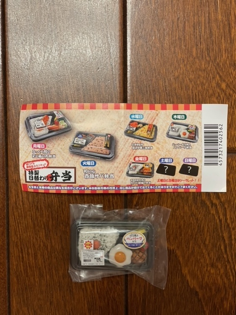 RAINBOW社提供の超リアル樹脂粘土ミニチュアシリーズの『特製日替わり弁当』シリーズより『木曜日 ジューシー目玉焼き ハンバーグ弁当』になります。画像の通りですが、袋はもともと密封されておらず、テープで閉じられています。1個400円ガチャだけあって商品名のとおり毎回リアルなミニチュアに仕上がっています。送料ですが普通定形外でよろしければ140円となります。
