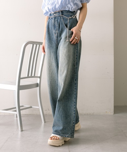 キーワード:ジーンズ デニム デニムパンツ レディース ハイウエスト フルレングス ワイドパンツ 無地