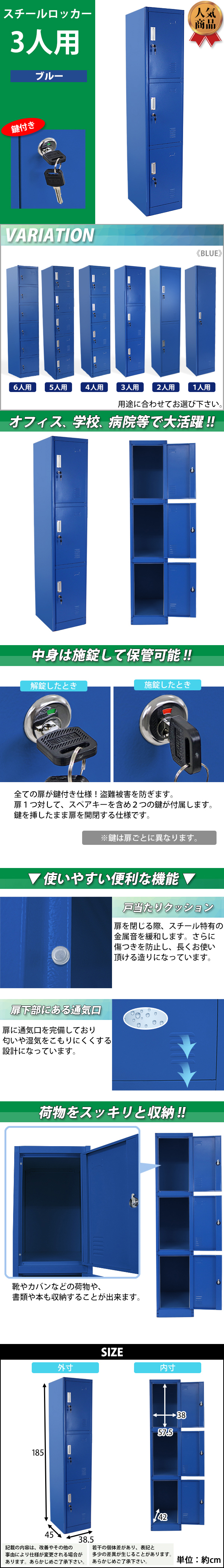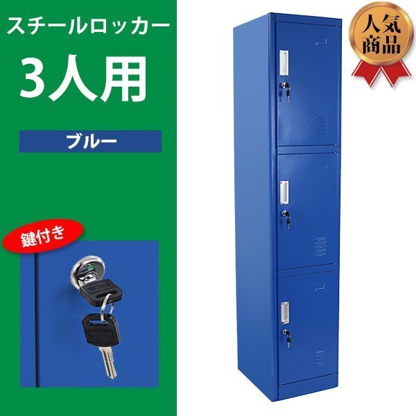 | 商品名 | 送料無料 ロッカー おしゃれ スチールロッカー 3人用 ブルー 鍵付き スペアキー付き 1列3段 スチール製 収納 オフィス 事務所 会社 店舗 病院 学校 業務用 スリム かぎ付き 更衣ロッカー 更衣室 オフィスロッカー スチールキャビネット オフィス家具 青 10007newbl |