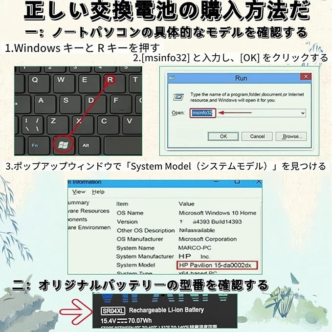 バッテリーのパラメータです】:44Wh-11.4V-3860mAh ノートパソコンのバッ リモデルの確認方法 WinキーとRキーを同時に押し、「ファイル名を指定して実行」で msinfo32と入力して起動後、[コンポーネント] → [電源] の順に展開し、バッテリー情報を確認します。