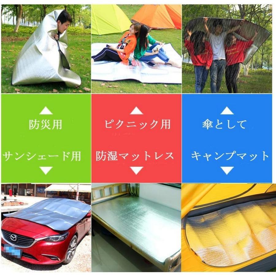 【断熱性・保温性】両面アルミ素材で、断熱性と保温性が抜群です。車のフロントウィンドウにかぶせると、シェードになります。災害のとき、保温シートとしても使用できます。