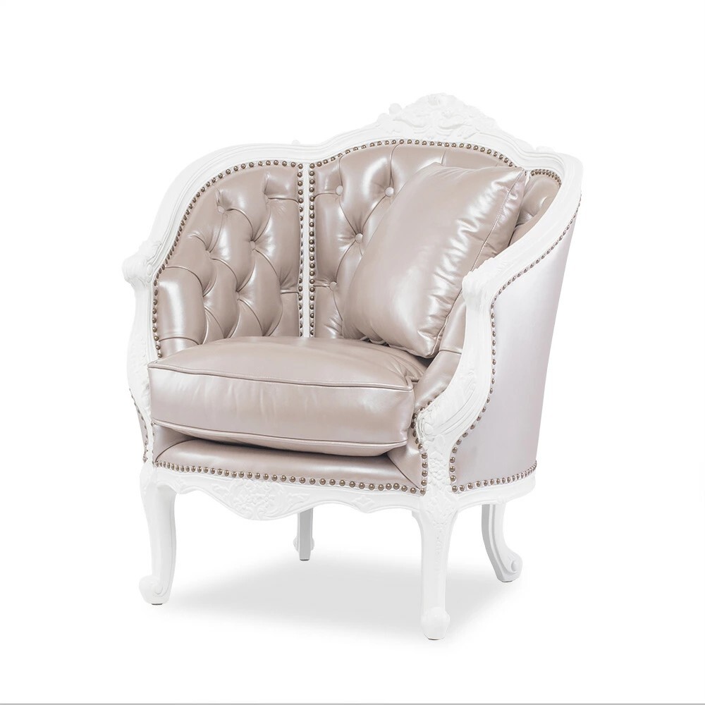 ホワイトとモーブの色合いが美しく調和し、ロココ調の繊細な彫刻が施された木製フレームは、見る者を魅了します。