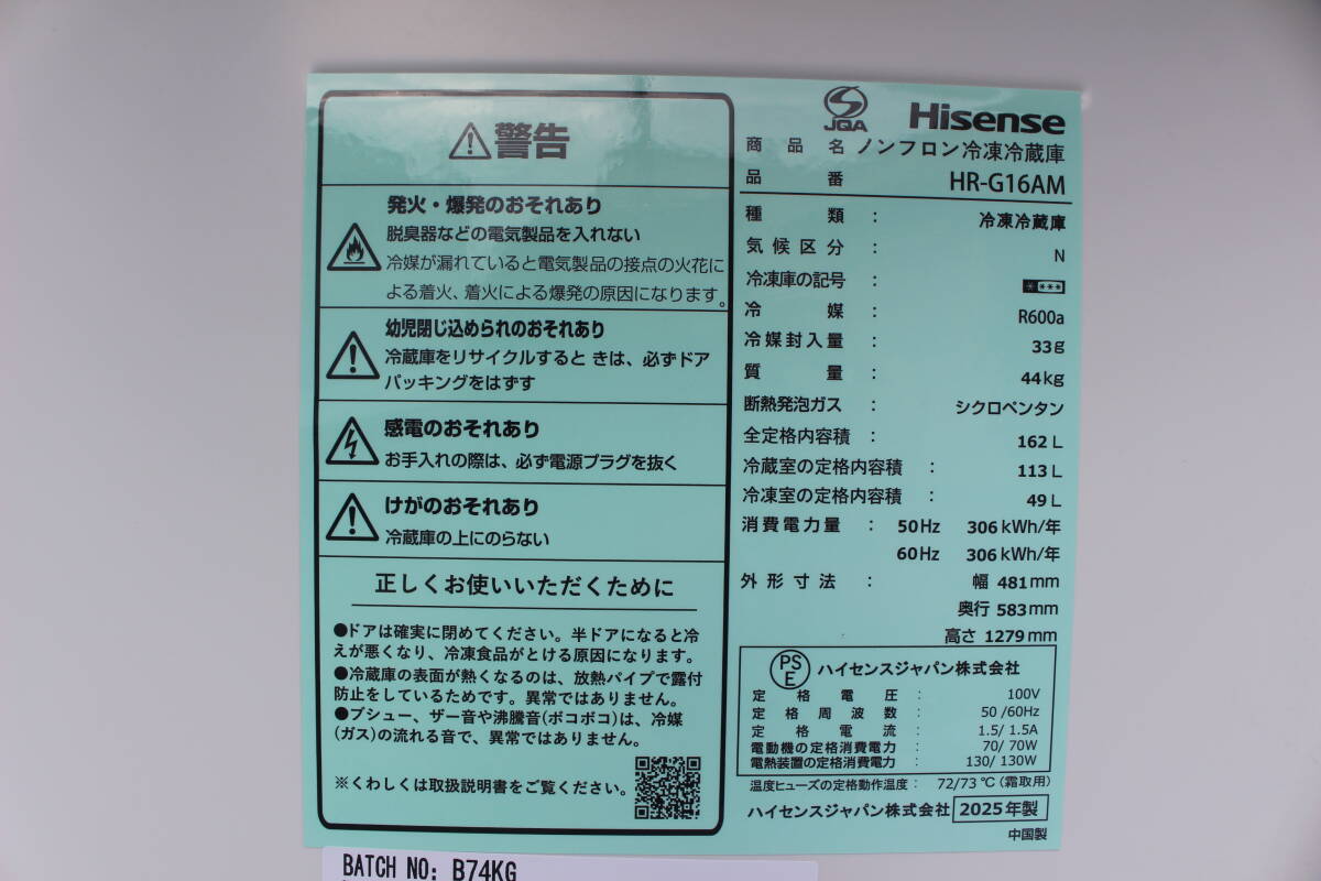 Hisense ハイセンス 冷凍冷蔵庫 ミラーブラック HR-G16AM [幅48.1cm /162L /2ドア /右開きタイプ] 2025年製 未使用展示品