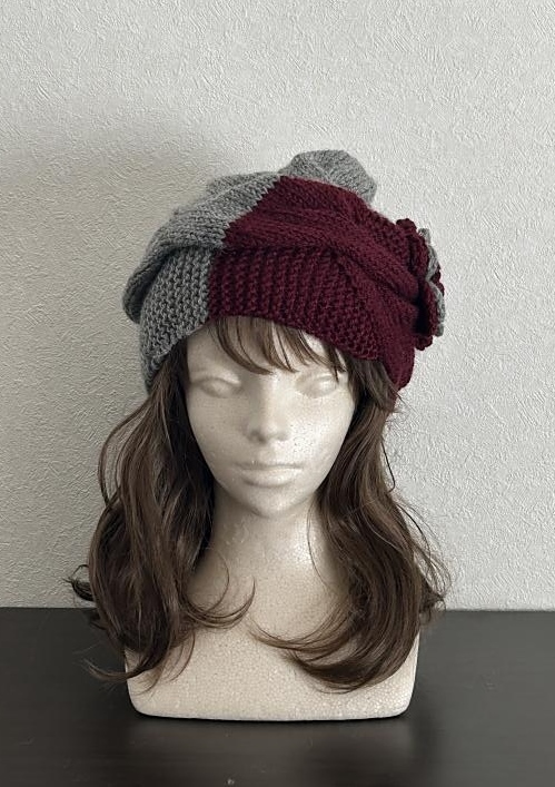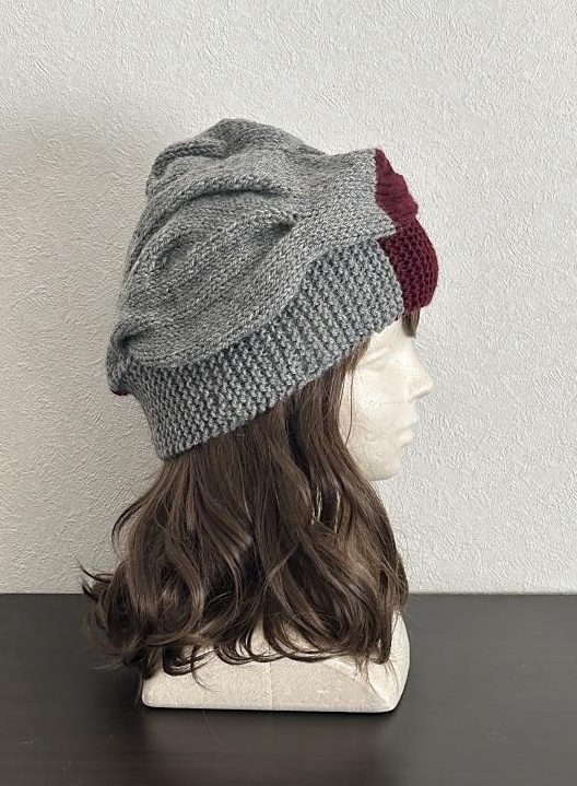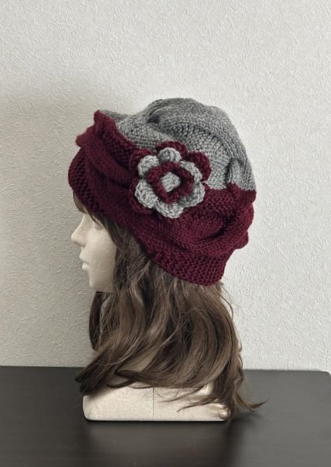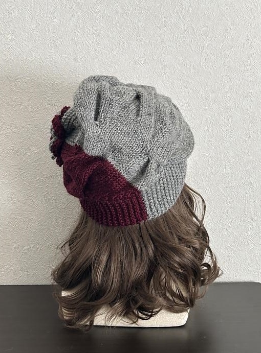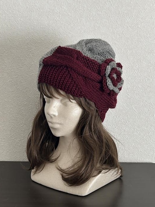 ★縄編みに一凛のお花ニット帽 レッド&グレー★ハンドメイド手編み帽子