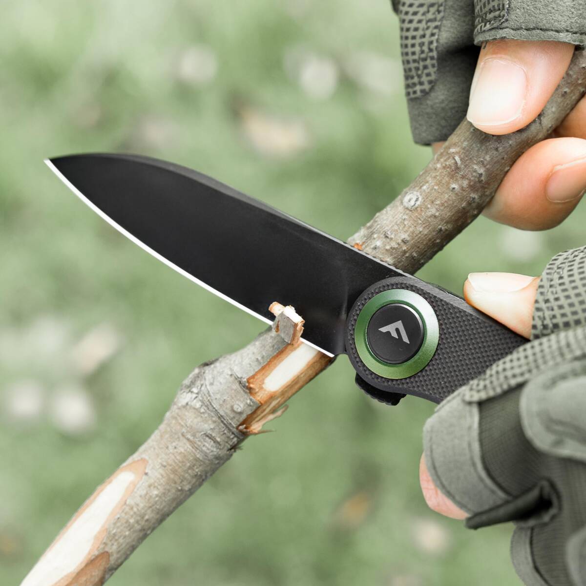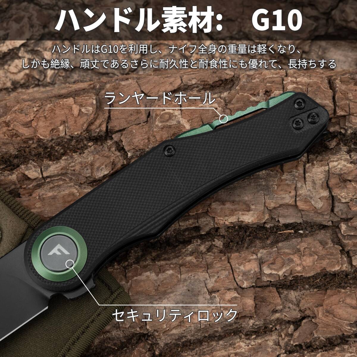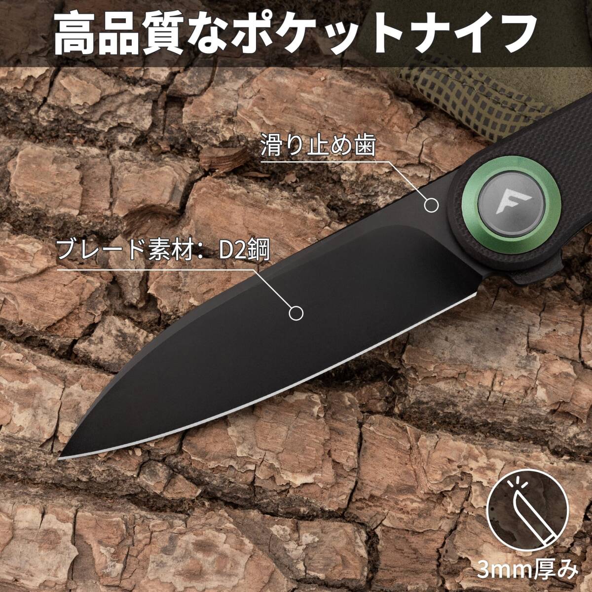 【抜群な切れ味&耐食性良い】この折りたたみナイフは高品質なD2ステンレス鋼を採用して、チタンコーティングが施されているため、摩耗や錆に強く、長期間にわたりその鋭い切れ味を維持します。キャンプナイフとして硬度が高く、耐食性にも優れています。木、竹などの素材を加工すること、枝をカットすること、ロープなどの素材をカットすることはスムーズに扱います。