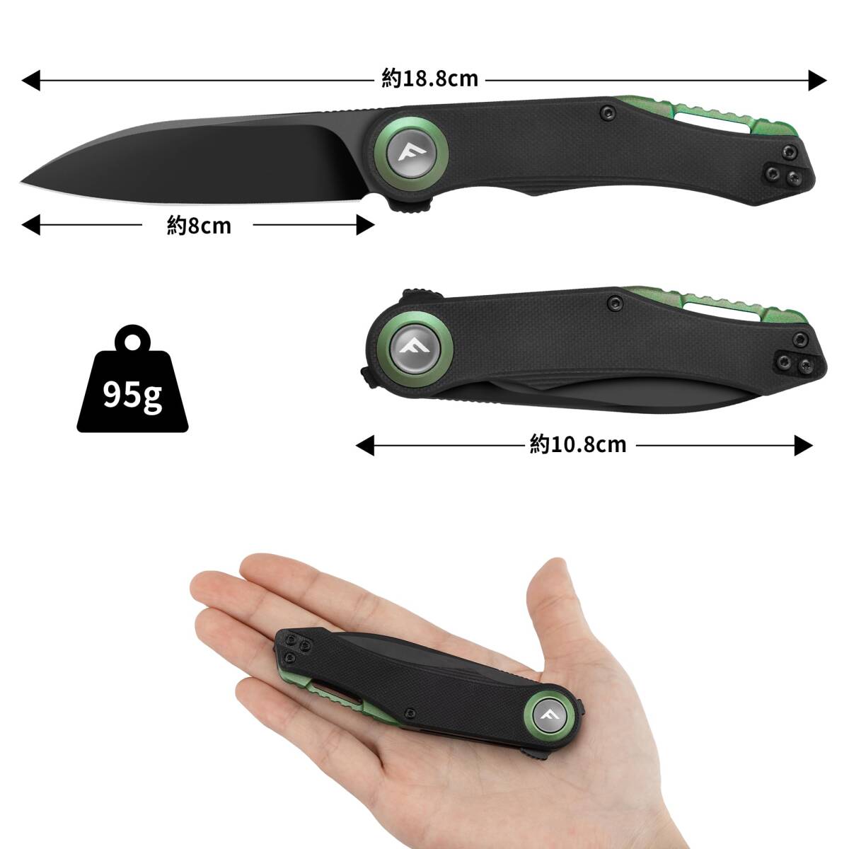 【商品仕様】全長:約18.8cm、刃体長さ:約8cm、刃厚さ:3mm。重量:約95g。ブレード素材:高品質なD2ステンレス鋼、柄材:耐久性に優れるG10材。