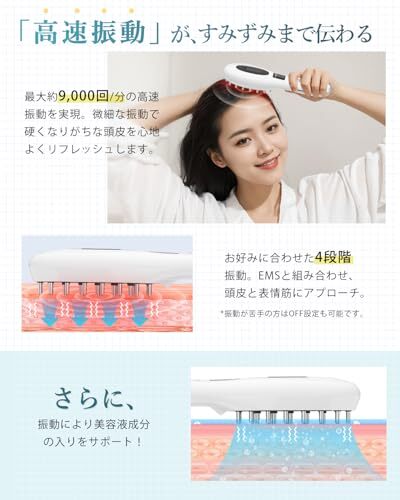 【プロ級の振動刺激】最大約9,000回/分の高速振動で、電動頭皮ブラシが硬くなった頭皮や肌をほぐし、心地よいリズムがリラックス感を提供。4段階調節でお好みの強度が選べます。さらに、振動が美容液成分の浸透をサポートし、より効果的なケアを実現します。※振動が苦手な方はOFF設定も可能です。
