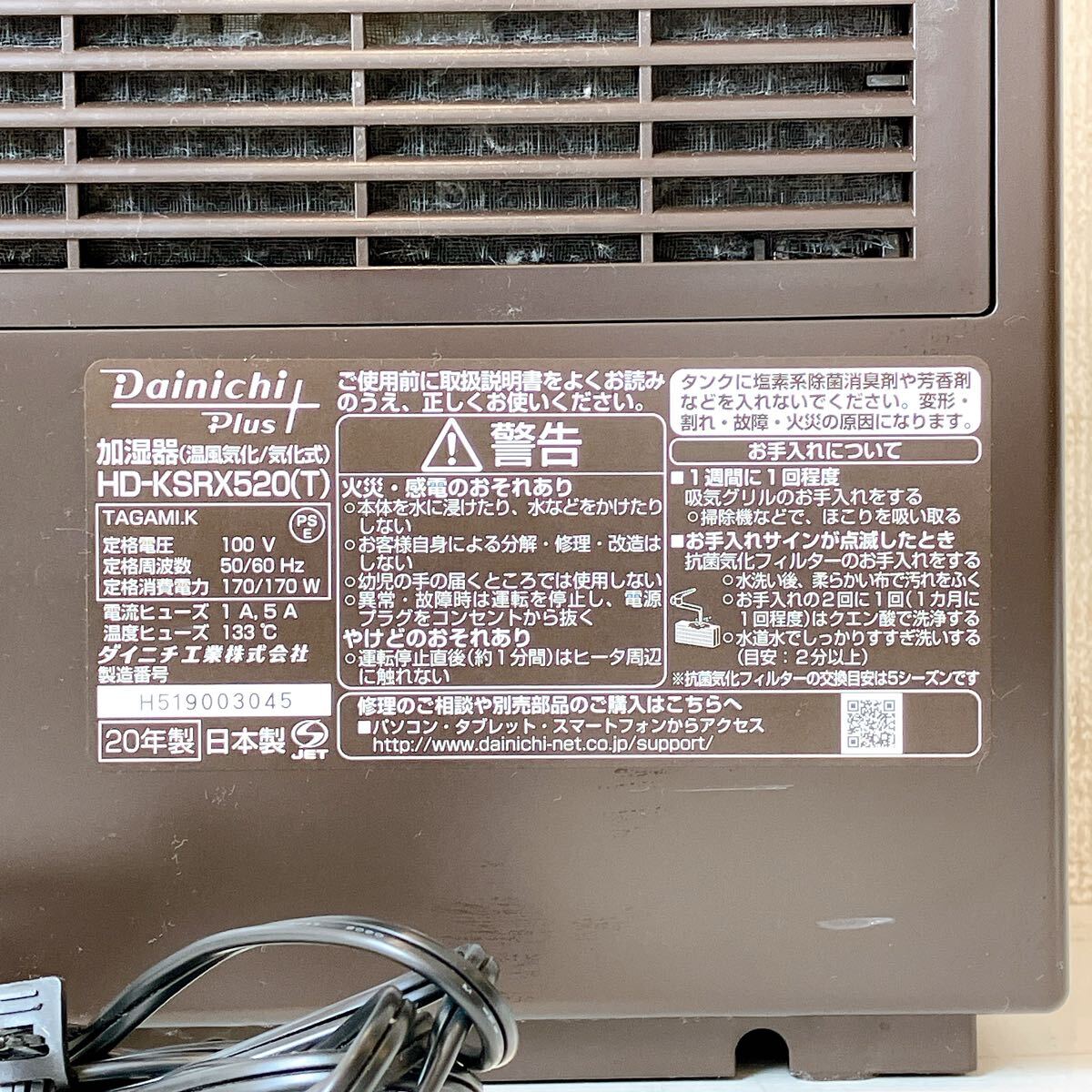 231*中古 ダイニチ DAINICHI Plus 加湿器 HD-KSRX520(T) 2020年製 温風気化/気化式 動作確認済み*