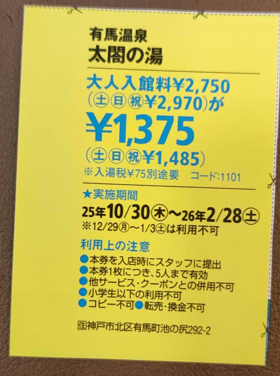 「有馬温泉太閤の湯」関西ウォーカー★雑誌切り抜きクーポン券・2枚