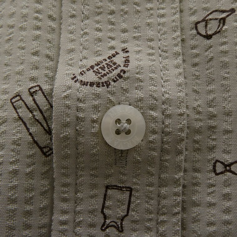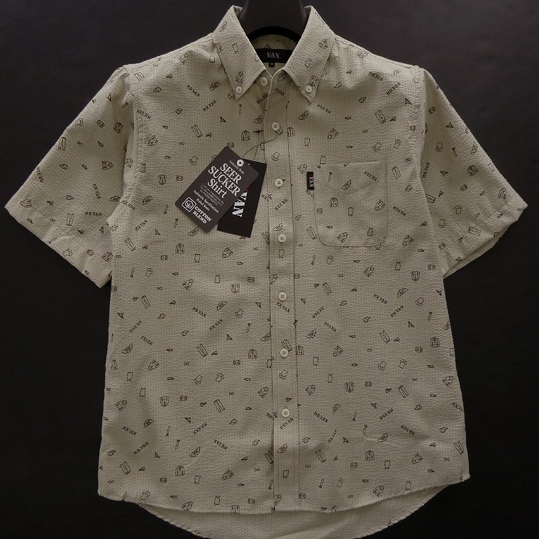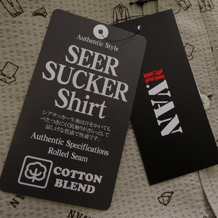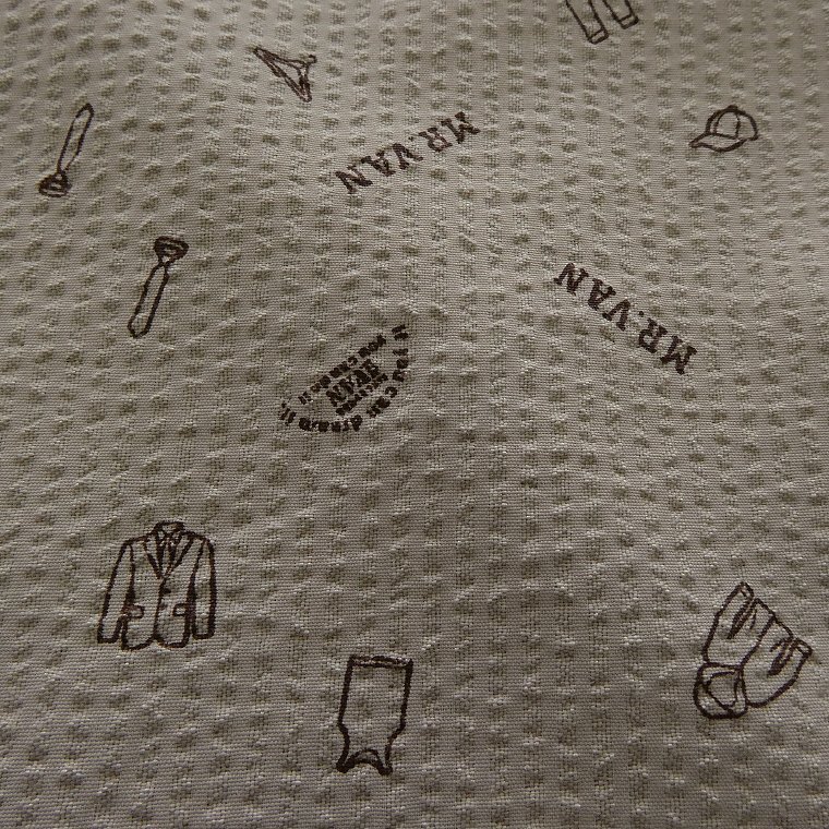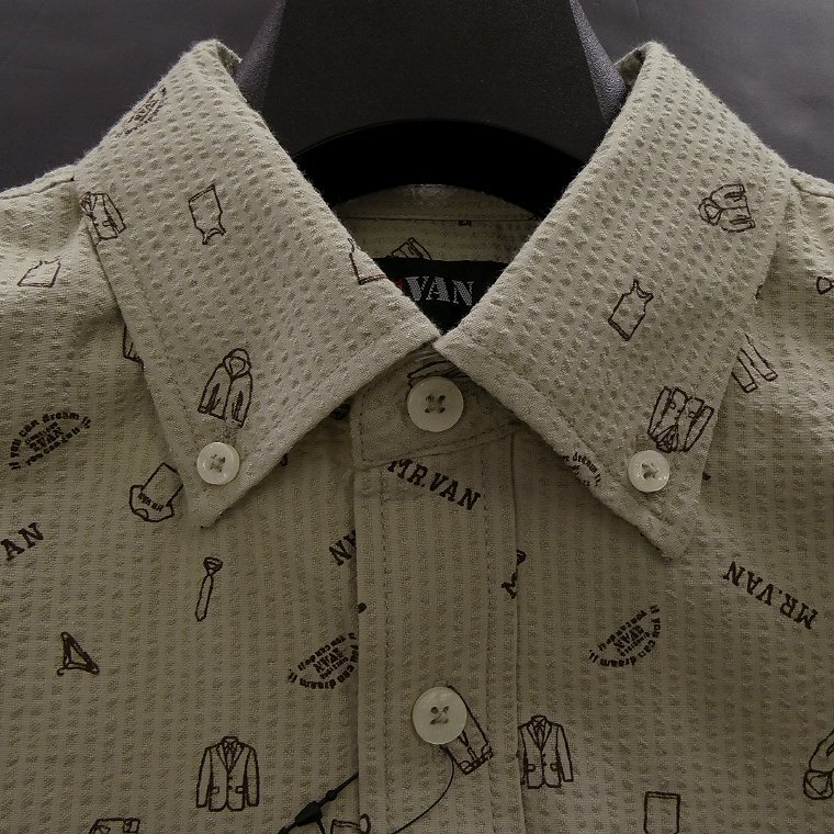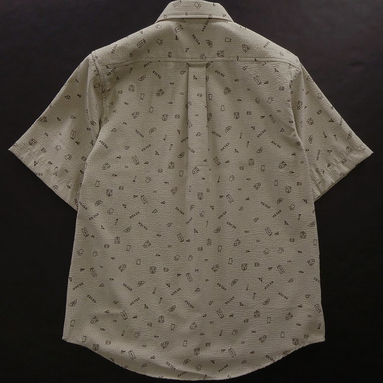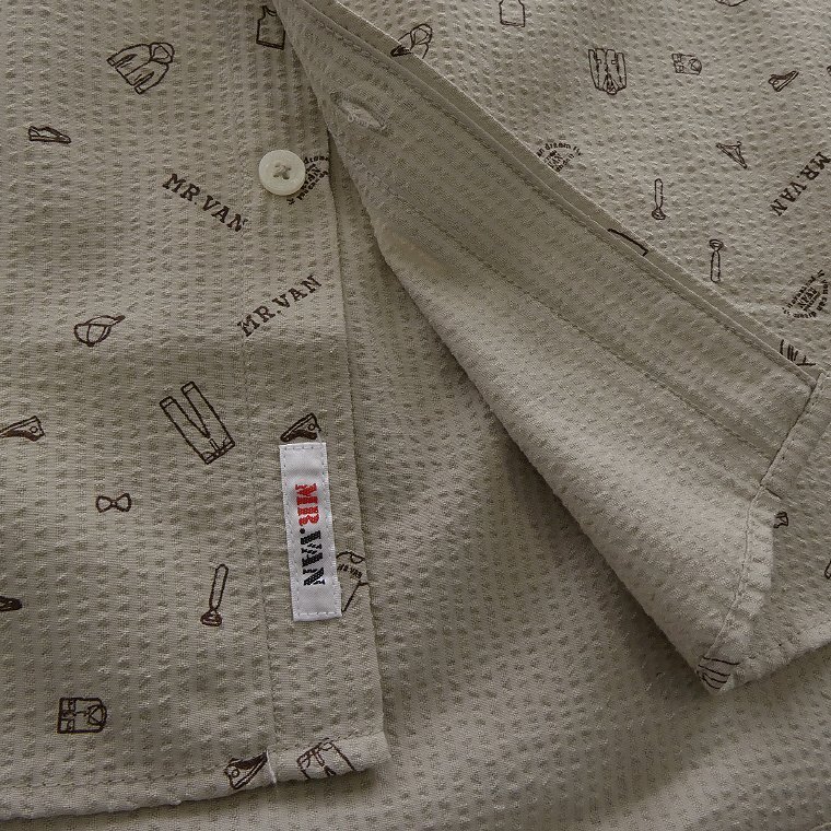 ・オリジナルロゴを含む複数の絵柄がプリントされたポップなデザイン。MR.VANらしい遊び心あるシャツに仕上がっております。 ・汗をかいてもベタつきにくく肌触りがサラっとして涼し気な質感のシアサッカー生地を使用。 ・開襟しても襟立ちが良いボタンダウンカラー、センターボックスプリーツ、左胸ポケットあり仕様です。 |