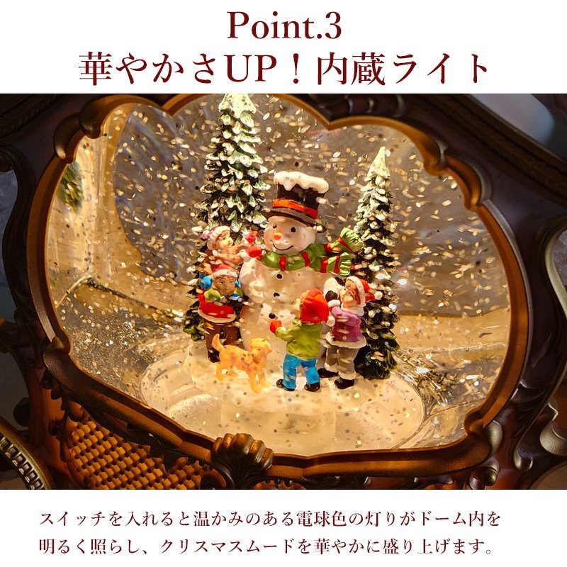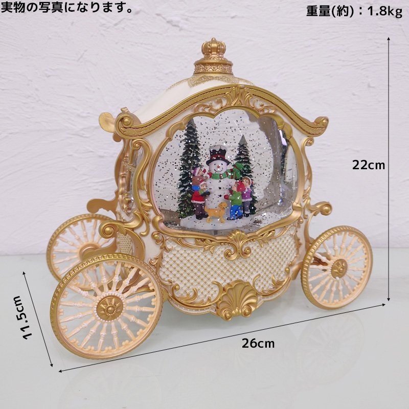 ![]() まるで物語のワンシーンを切り取ったような、幻想的なスノードームキャリッジ。 煌びやかなゴールドの装飾とホワイトのボディが目を引くクラシカルなデザインで、クリスマスシーズンのインテリアにぴったりです。 ドームの中では、サンタクロースと子どもたちがプレゼントを囲み、舞い散る雪に包まれながら温かな光に照らされています。 ライトを灯すと、キラキラと輝く雪が幻想的に舞い、まるで小さな劇場を覗いているかのよう。 玄関やリビング、ツリーのそばに飾れば、一気にクリスマスムードを演出します。 プレゼントとしても喜ばれる、心温まるスノードームです。 給電方法は2つ、付属のUSBコードで使用する他、 単三電池3本でコードレスとしての使用も可能! 精巧に作られている為、ライトを点灯させずに 単体でオブジェとして使用しても存在感抜群です! ギフトなどにもおすすめです! ●動作パターン● ・未点灯 ・LED点灯(音楽なし) ・LED点灯(音楽あり) ※乾電池、USB出力用のアダプターは付属しておりません。 点灯時の様子は動画でご覧くださいませ。 動画はこちら ↓↓↓↓↓↓↓↓↓↓↓↓↓ こちらをクリック! 【商品詳細】 カラー:ホワイト サイズ(約): 高さ22cm×幅26cm×奥行き11.5cm コード長さ(約):98cm 重量(約):1.8kg 素材:プラスチック 【給電方法】 単三電池×3/USBコード |