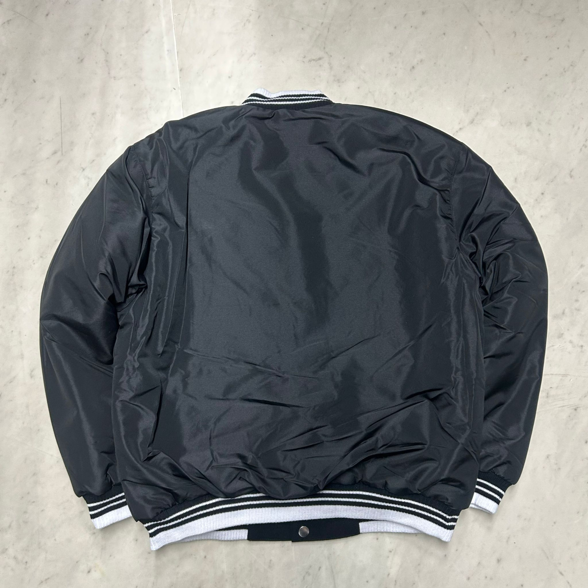 ・一方はしっかりとしたウールブレンドのボディに、袖はPUを使用したクラシックなバーシティスタイル