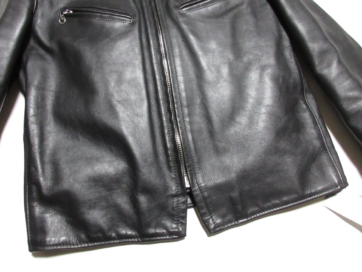 ●MADE IN USA/米国製/上野商会別注品 | ●定価:¥159,500 (税込) ●Model:641XX/7009 ●素材:牛革、裏地/ナイロン55%ポリエステル45% ●カラー:ブラック ●サイズ表記 42 *実寸(平置き 約㎝) ・袖丈 65 (肩ステッチから袖先) ・肩幅 49 (肩ステッチから肩ステッチ) ・身幅 59 (脇下から脇下) ・着丈 64 (後ろ襟元付け根から裾) (※袖丈、身幅はフロント側から、肩幅、着丈は背中側をラインに沿って測定しています。多少の誤差はご了承下さい) 日本限定で復刻した641XXは、現行の641モデルと違い1960年代に生産されていたモデル。上質な ジェニュインステアハイドを採用し、ディテールやサイズスペックを忠実に再現しています。実際にバイクに乗ることを考えた仕様となっており、ショルダー部分の後ろ側 にはアクションプリーツが施され、ウエストアジャスターがなく、ライダーの内臓を守る為施されたウエスト後部の切り替えが可能なキドニーパッドを採用。身幅、腕繰りはタイトに、着丈、袖丈はやや長めに変更され、日本人の体系にジャストフィットする綺麗なシルエットとなっています。米国製。