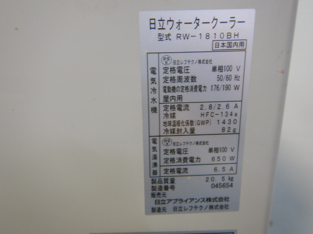 2015年製 日立 ウォータークーラー RW-1810BH 水道直結 ディスペンサー 18L W300D505H600mm 20.5kg 冷水器 冷水 温水兼用 ホット コールド