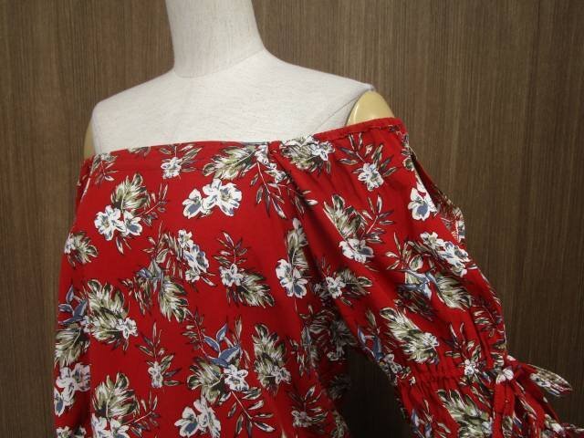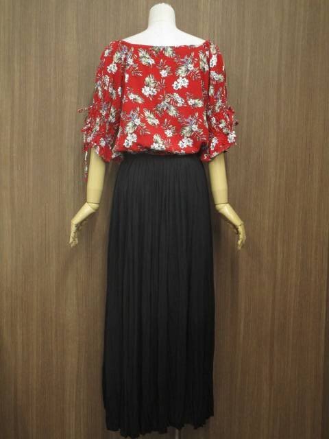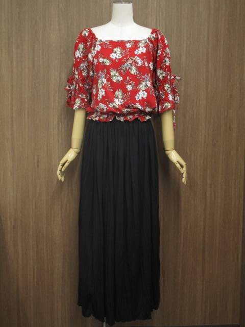 洗える五分袖プルオーバ―ブラウス+ロングプリーツスカートコーディネート上下2点セット L相当 レッド地 ホワイト×ブルー系×ベージュ 花柄/ブラック ガーリー系 20代・30代~