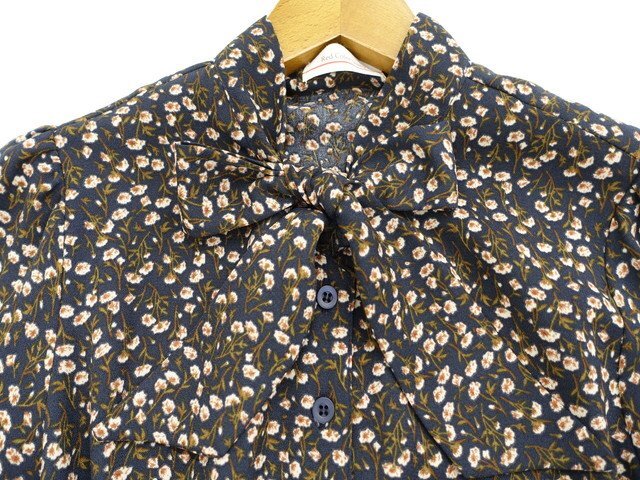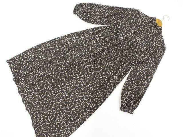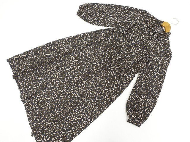 洗えるロング丈 パフスリーブ 長袖 ボウタイネック ワンピース M ネイビー地 ホワイト×ブラウン 花柄