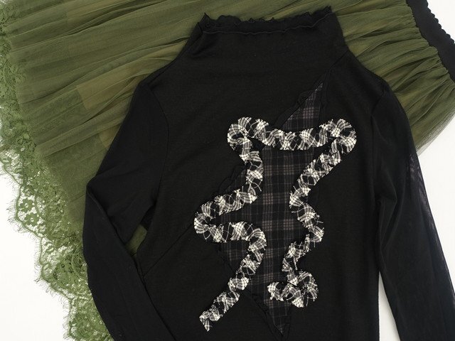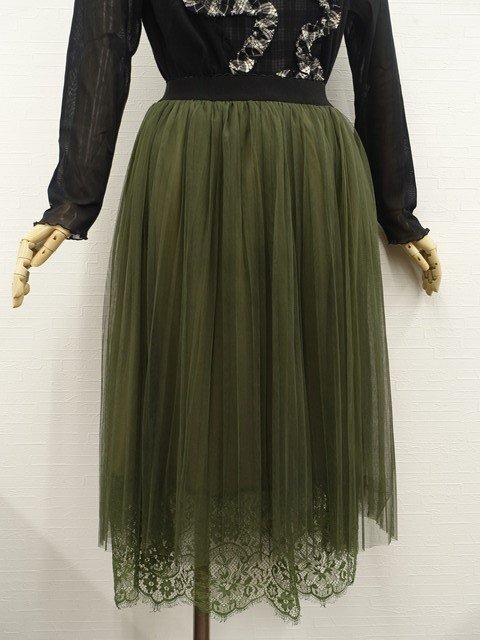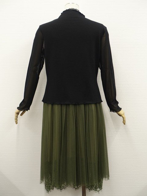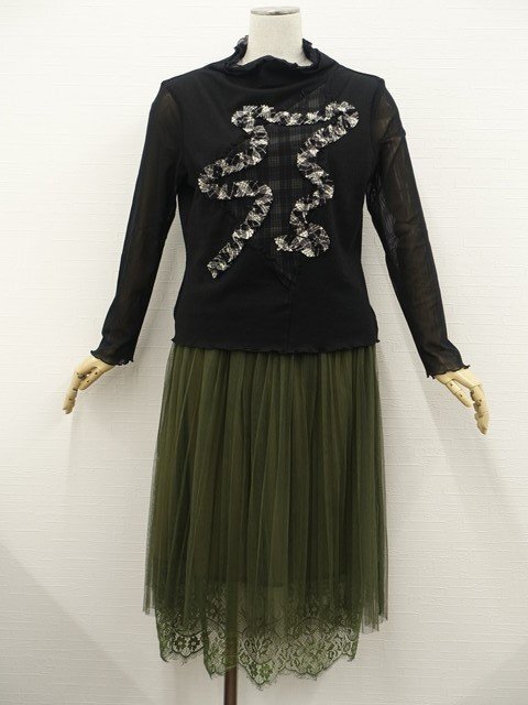 長袖カットソー+ロングレースギャザープリーツスカート コーディネート上下2点セット M相当 ブラック&ブラック×ホワイト チェック/グリーンカーキー×ブラック&グリーンカーキー 花柄 ガーリー・ナチュラル 20代