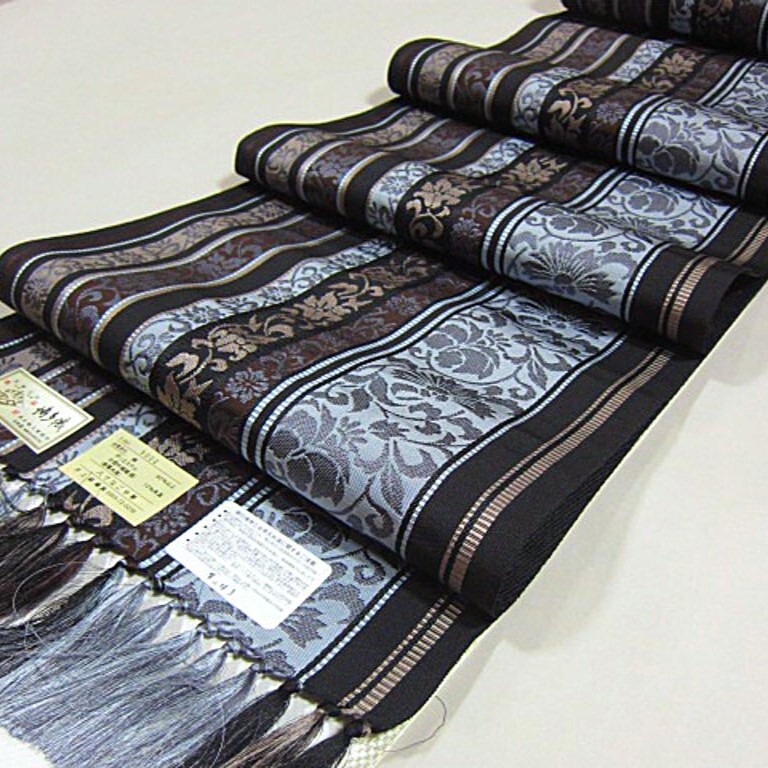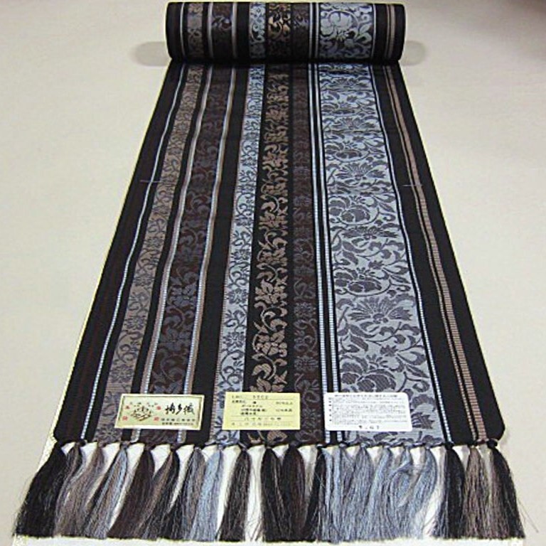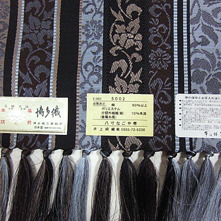 新品未仕立   正絹 本場筑前博多織八寸名古屋帯です。品質は、正絹90% ポリエステル・分類外繊維10%です。『博多織の起源は、焼く七百六十余年前、博多の満田弥三右衛門が栄に渡り、漢織・呉織等の技術を取得し、帰朝して伝えたことに始まります。満田弥三右衛門から焼く三百六十年後、竹若伊右衛門が始めて帯地を織り出し、博多織と名づけたといわれております』博多織の帯は締めやすく、それでいて一度締めると緩みにくいことに定評があり、この扱いやすさこそが博多織の魅力です。着こなしを上品に盛り上げてくれる一品かと思います。織り上がったばかりのお品です。