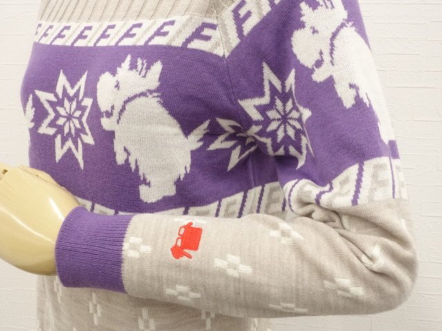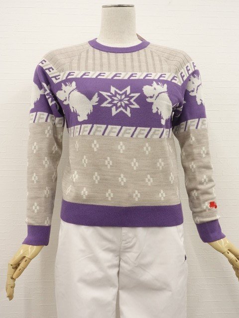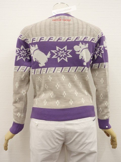 ラグランスリーブ 長袖 クルーネック 洗えるニットセーター ゴルフ S グレージュ杢×パープル×オフホワイト ケンケン柄
