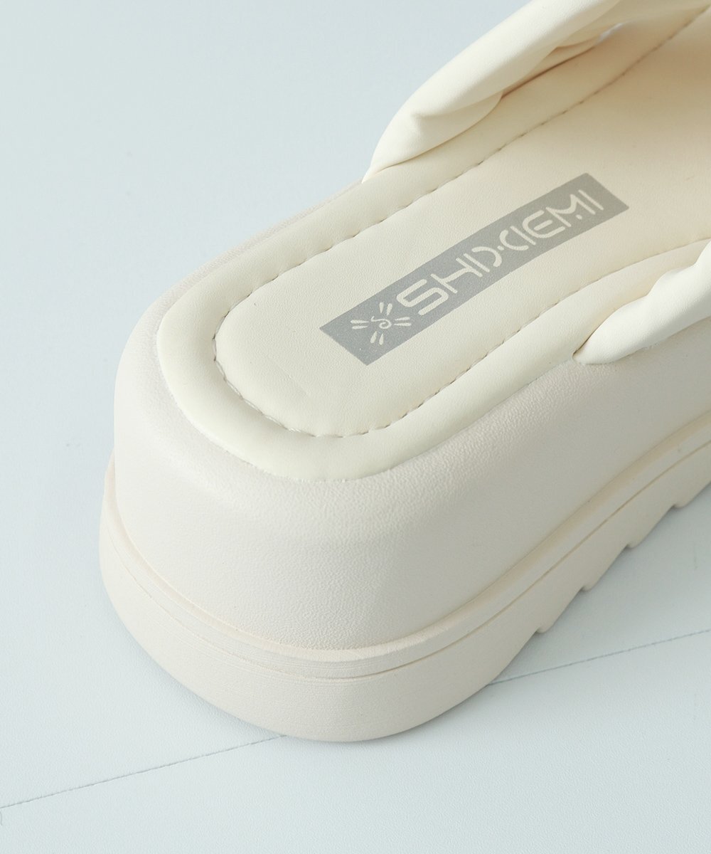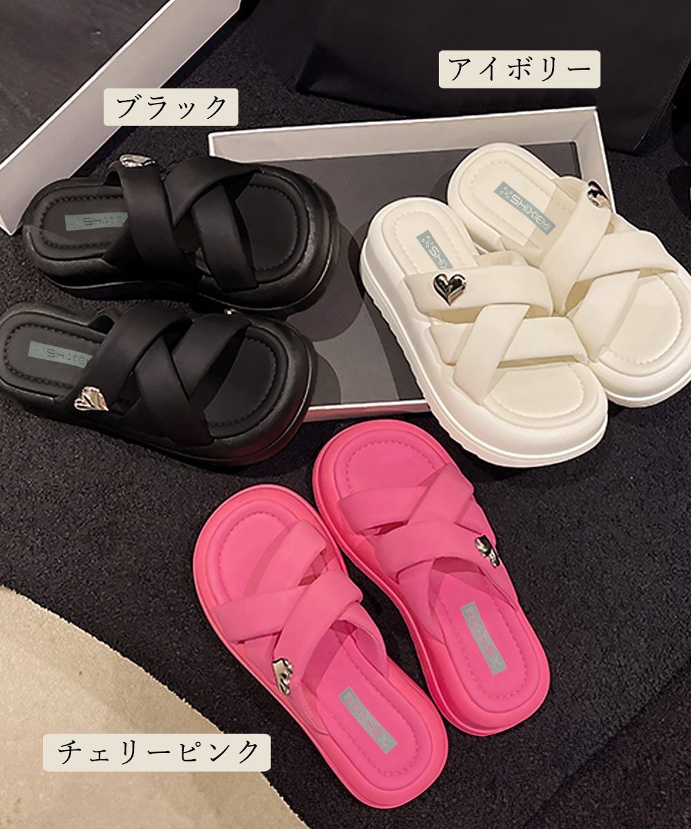 夏っぽいチェリーピンクを含めたブラックとアイボリーの3色展開の厚底ミュールサンダル。