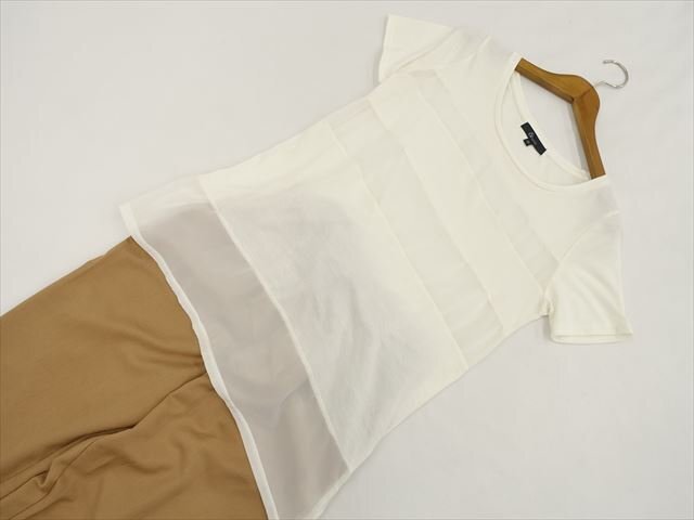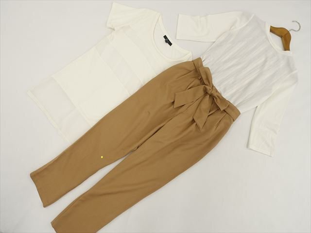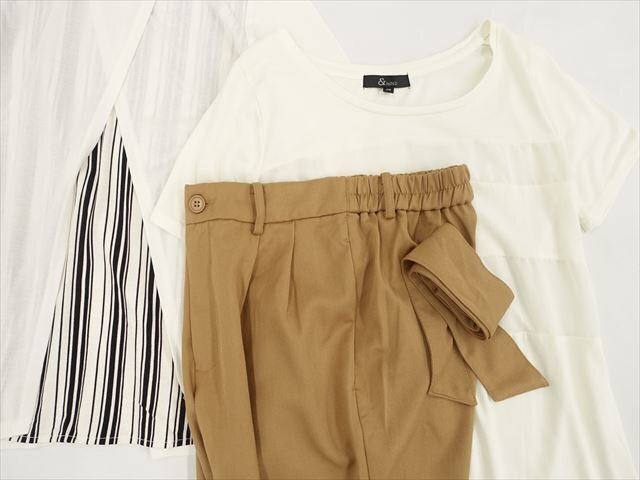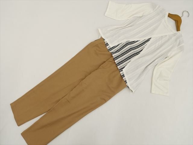 半袖ロングカットソー+七分袖カットソー+テーパードパンツ コーディネート上下3点セット M相当 オフホワイト/ホワイト&ホワイト×ブラック ストライプ柄/キャメル シンプル・きれいめ・オフィス系 20代・30代・40代・50代~