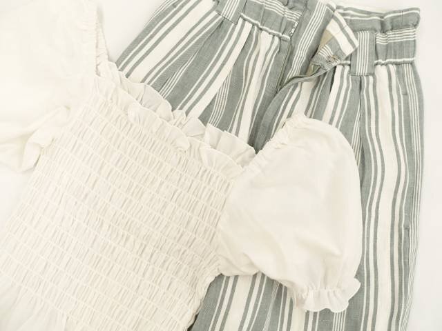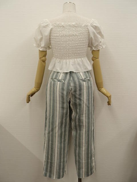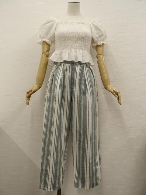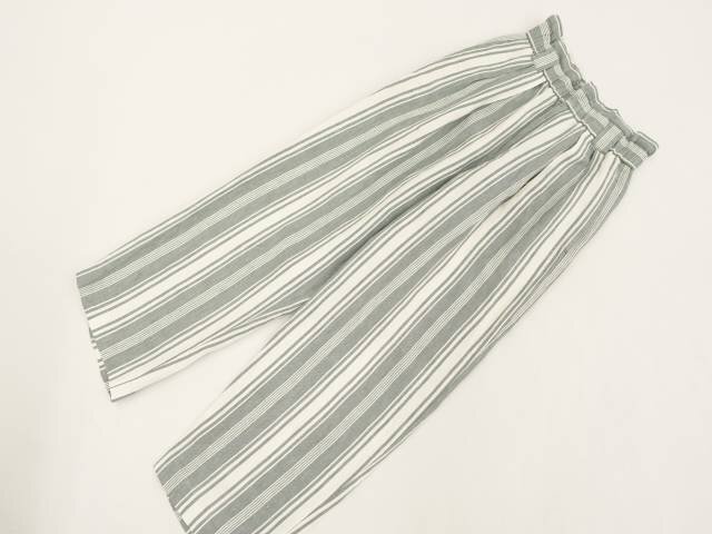 洗える半袖プルオーバーブラウス+ワイドパンツ コーディネート上下2点セット M相当 オフホワイト/グリーン系×ホワイト ストライプ柄 ガーリー・ナチュラル系 20代