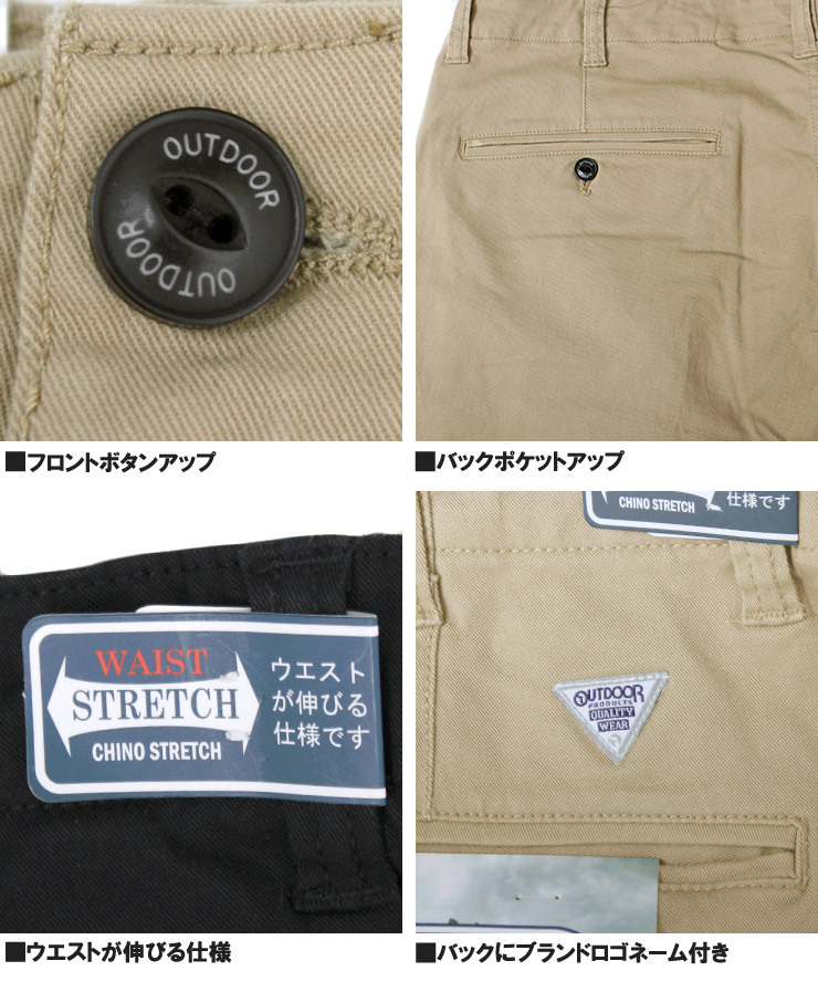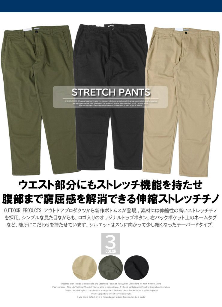 | 商品説明 | OUTDOOR PRODUCTSより実用性とファッション性を兼ね備えたチノパンツの登場です。 |