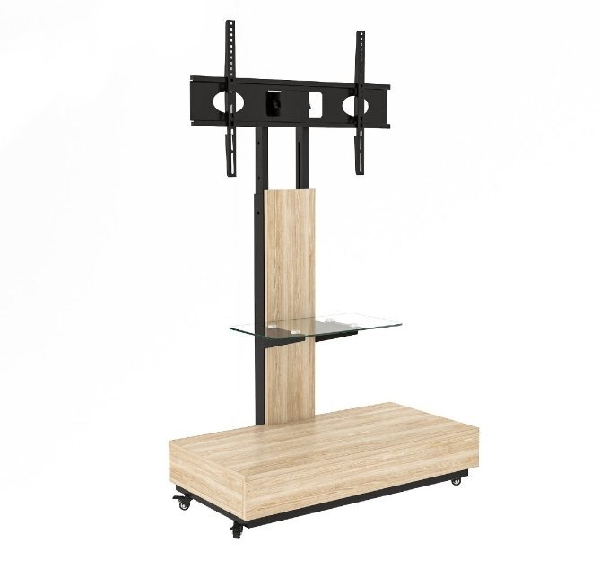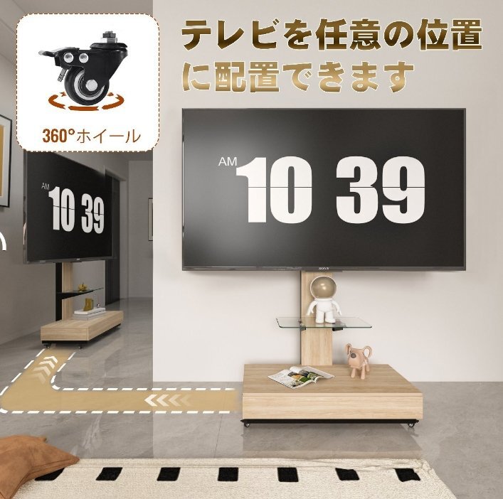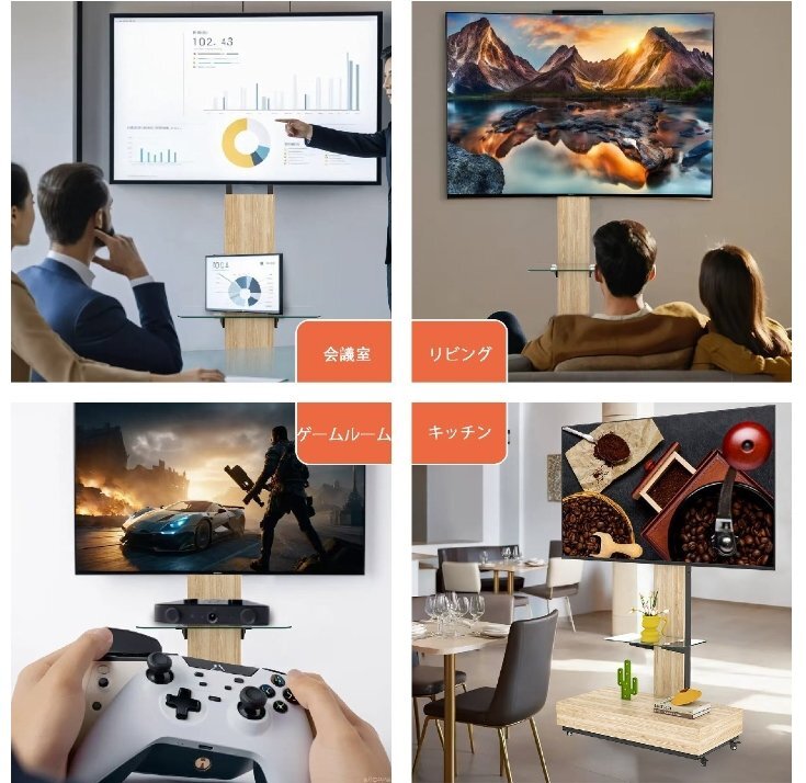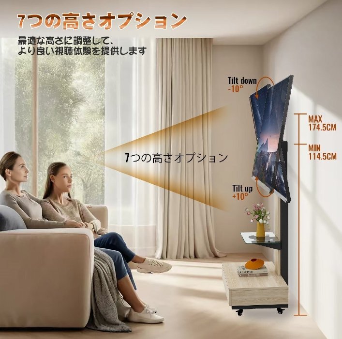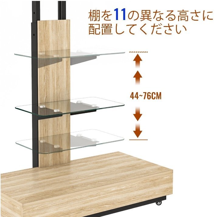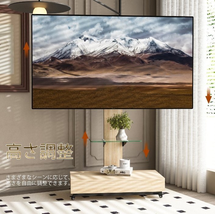 迅速配送・引き出し付き 可動式TVスタンド 32-75インチ対応 高さ調整可能 木目&ガラス製 キャスター付き リビング・寝室・オフィス用