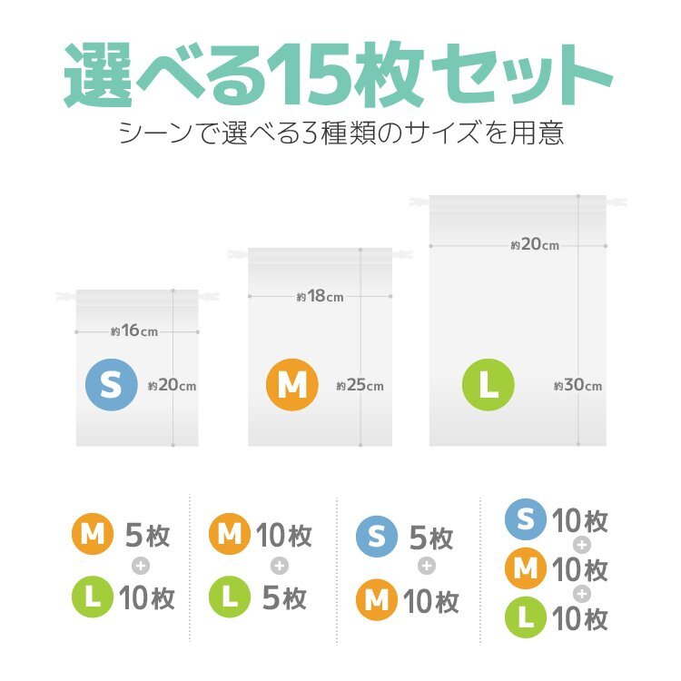 セット内容:ビニール巾着ポーチ×15枚(S5枚・M5枚・L5枚)
