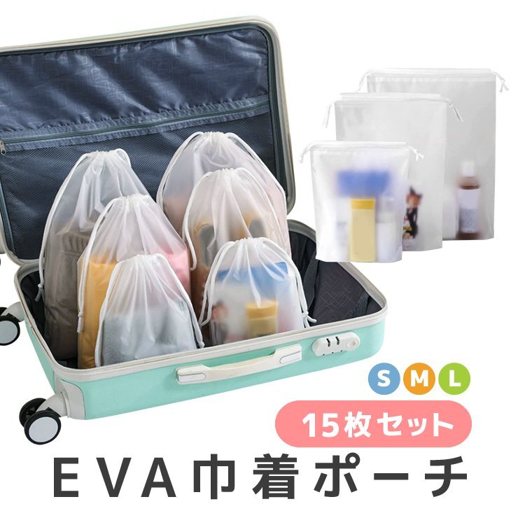 ◆ビニール巾着袋 EVAポーチ 15枚セット S/M/L 半透明 防水防湿 マチ付き 収納袋 収納ポーチ 着替え服/化粧品/靴袋/水着/ジム/出張/旅行/水泳/海水浴/温泉/スキーなどに【各サイズ5枚ずつ】VKB15S