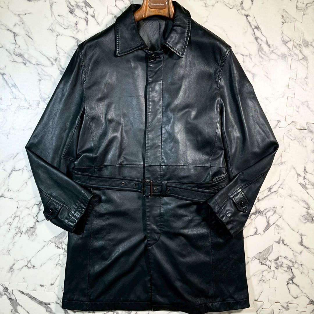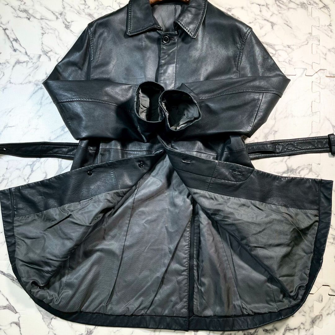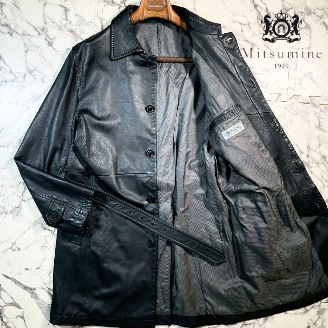 【圧倒的存在感!!】(L)●MITSUMINE オールレザー ステンカラーコート 山羊革 ミツミネ ゴートレザー ベルト ロング ブラック 黒 メンズ