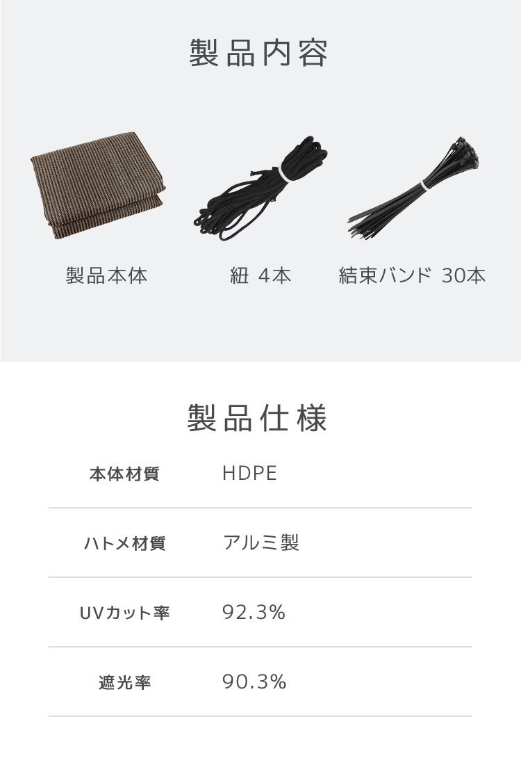 暑さ対策と目隠しにも最適な日除けシェードです。 ■風通しのいい通気タイプで快適 UVカット率90%以上&遮光率92%以上! 日差しをしっかりカット!室温上昇を抑制し、 通気性のある素材が風を通すので、快適に過ごすことができます。 ■目隠しにも最適 外からの気になる視線も遮り、プライバシーを守ります。 ■錆びにくいアルミ製のハトメ ハトメを多めに使用しているので、しっかり固定できて安全です。 縦にも横にも使えてピンっと張れます! ■軽量タイプで取り付け簡単 付属の紐や結束バンドを穴に通して固定するだけなので、取り付けも簡単♪ 【商品詳細】 カラー:モカ 材質:HDPE 付属品:ロープ(約160cm)×4本、結束バンド×30本 サイズ:約200×300cm |