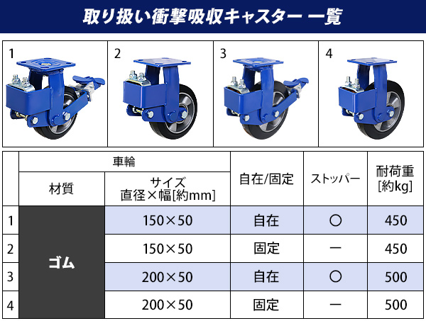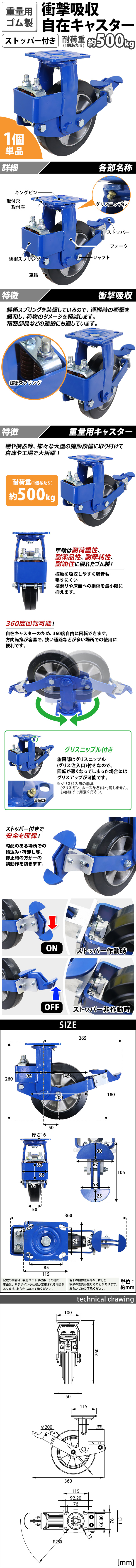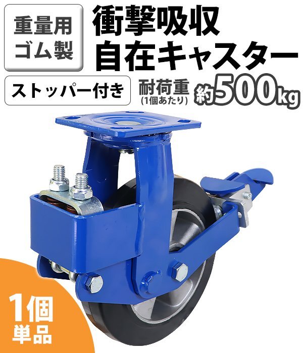 | 商品名 | 送料無料 緩衝キャスター 自在キャスター 重量用 ゴム製 ストッパー付き 1個 単品 衝撃吸収キャスター 重量用キャスター 耐荷重約500kg(1個あたり) 車輪直径約200mm 幅約50mm 衝撃緩和 軽減 緩衝スプリング バネ ゴムキャスター ゴム車輪 ブレーキ付 運搬 sacsh8001pru1p |