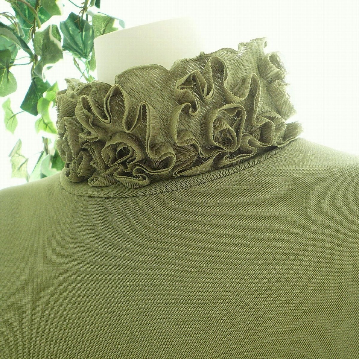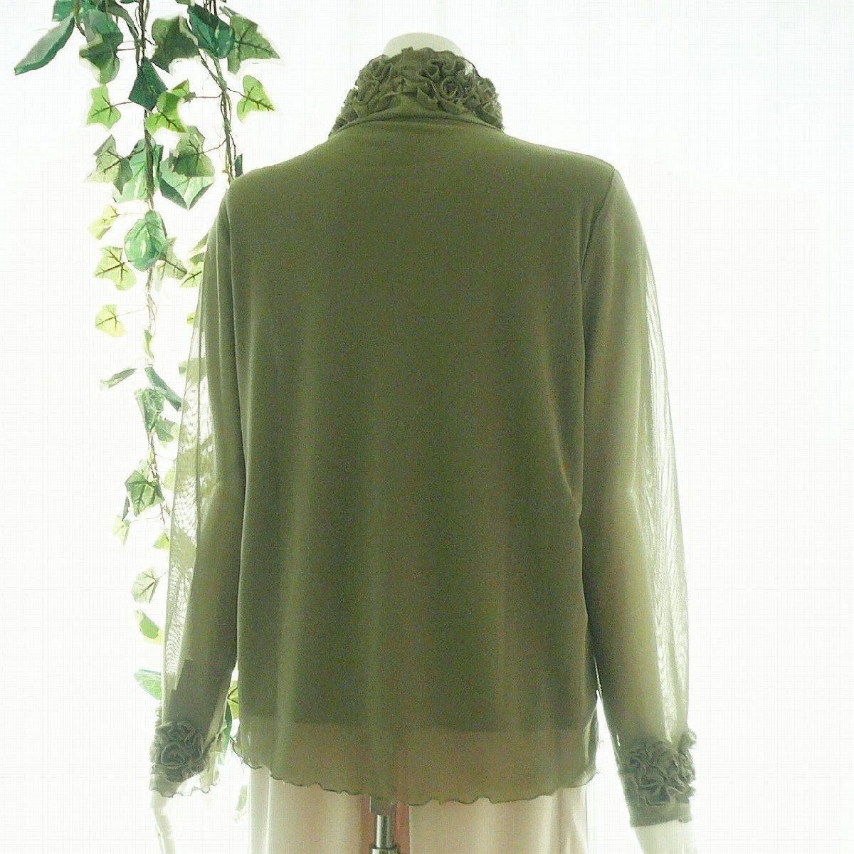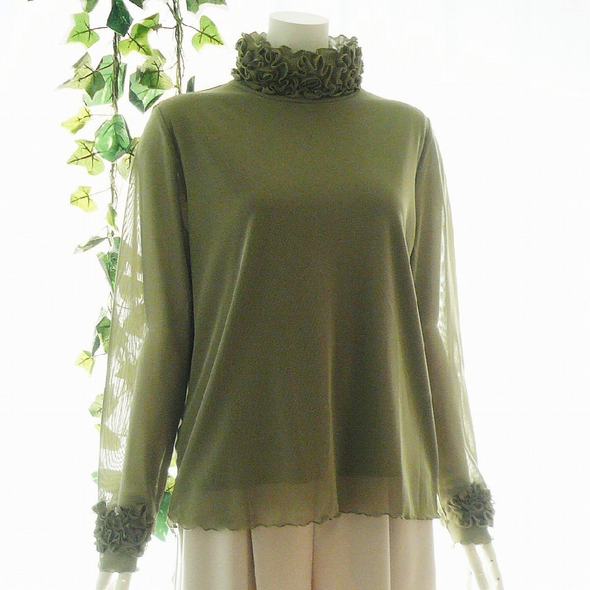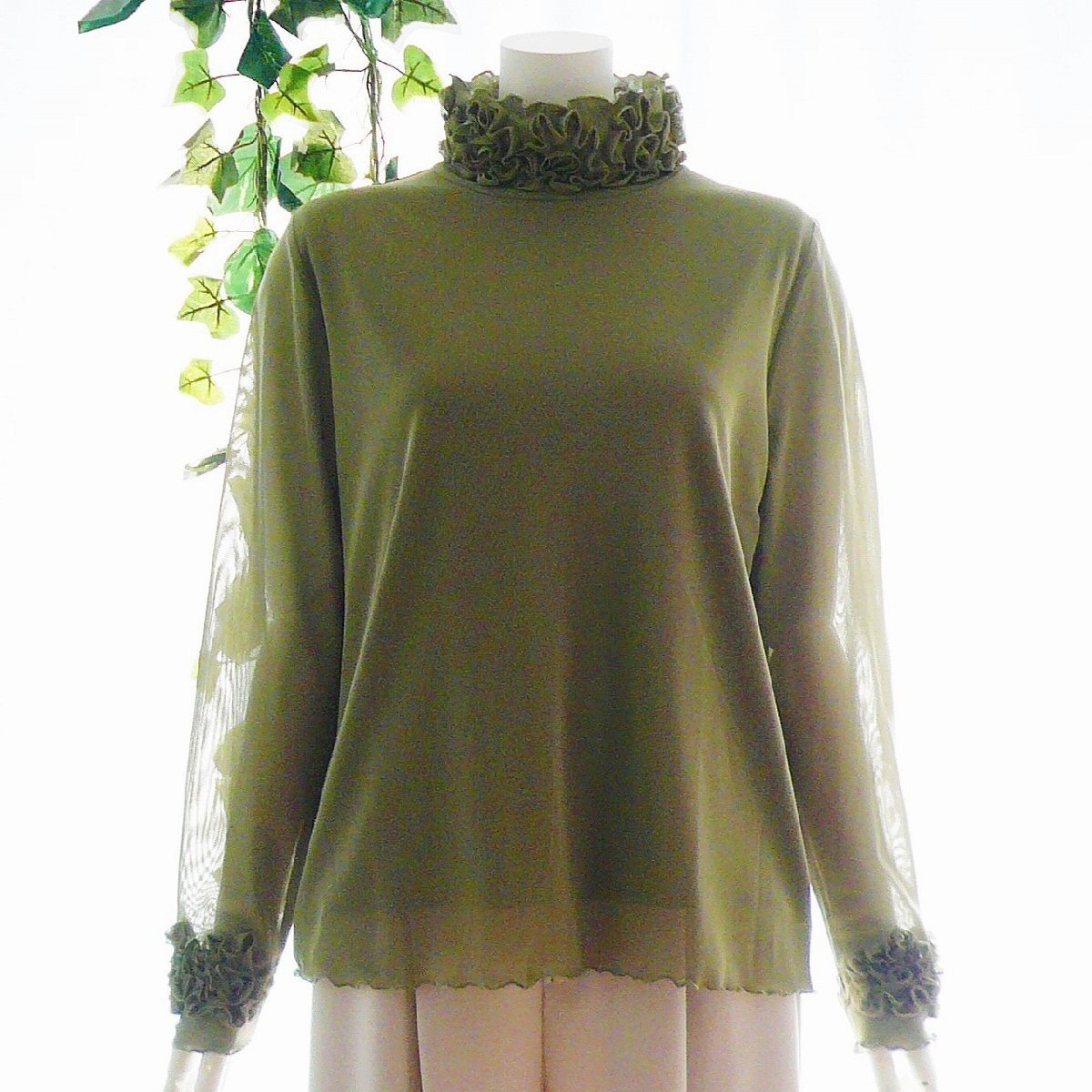 新品 9622 ML 花モチーフ メッシュ ハイネック カットソー ブラウス くすみ緑 袖花モチーフ レディース ストレッチ 上質