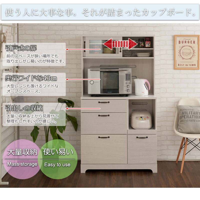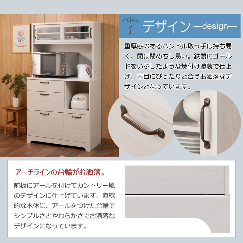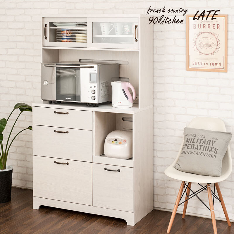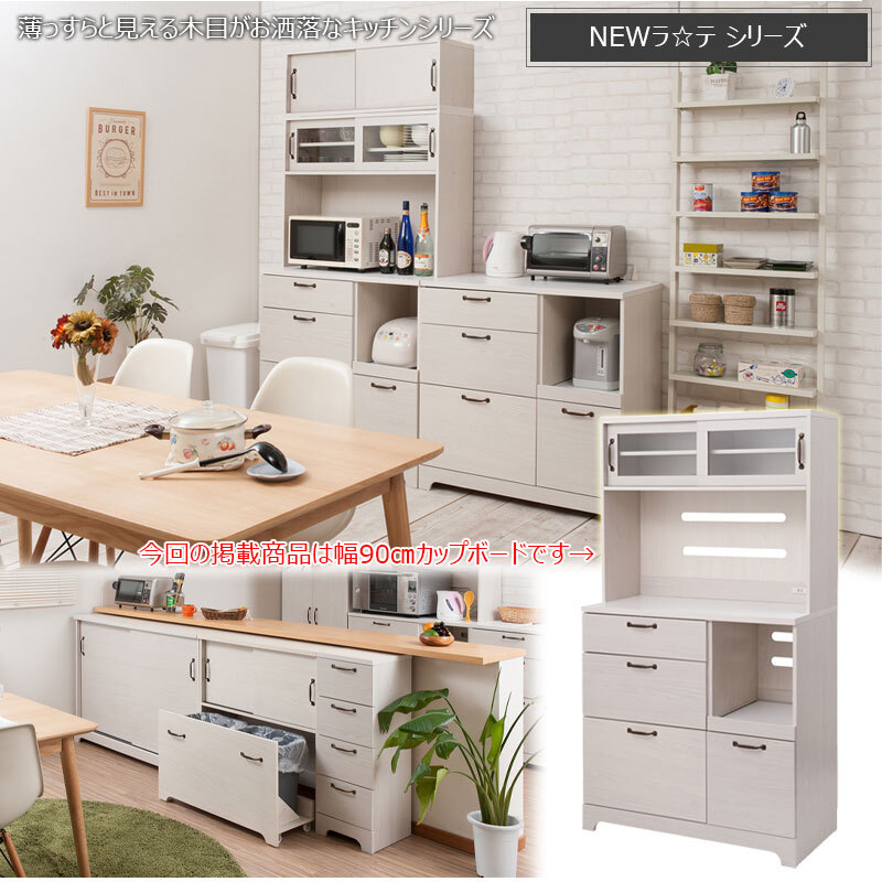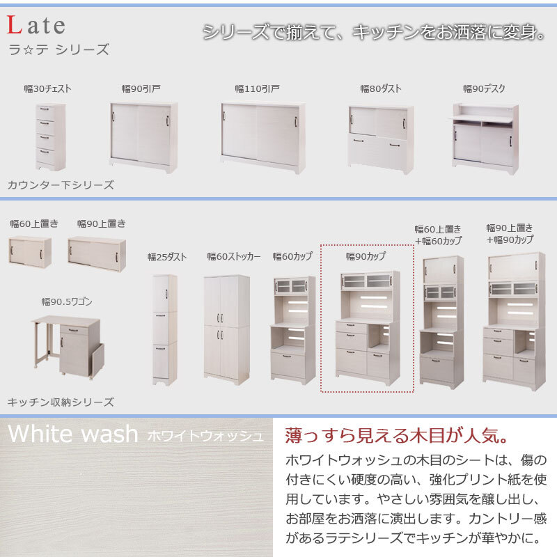 ■商品について/フレンチカントリーチックに仕上げた『Late』ラテシリーズ。シンプルな中に重厚感あるトランク取っ手、台輪部をアーチ状にくり抜くなど、インテリアになじみやすく、それでいて存在感のある家具をイメージしたカントリーライン。扉は引戸式にし、狭い部屋でも使いやすく、限られた空間に収納機能を凝縮。キッチンボードは背丈を少し低く、上台を奥まらせたことで、圧迫感のないスタイルに。さらに収納を追加したい方に上置きも取りそろえ、間仕切りにも使えるカウンターやカウンター下・リビングボードとして薄型引戸キャビネットもラインナップ。『Late』シリーズは、やさしい木目で一人暮らし、二人暮らしにも使いやすいサイズ感がうけています。