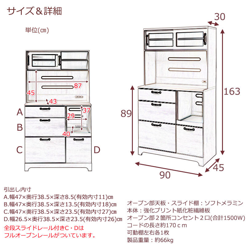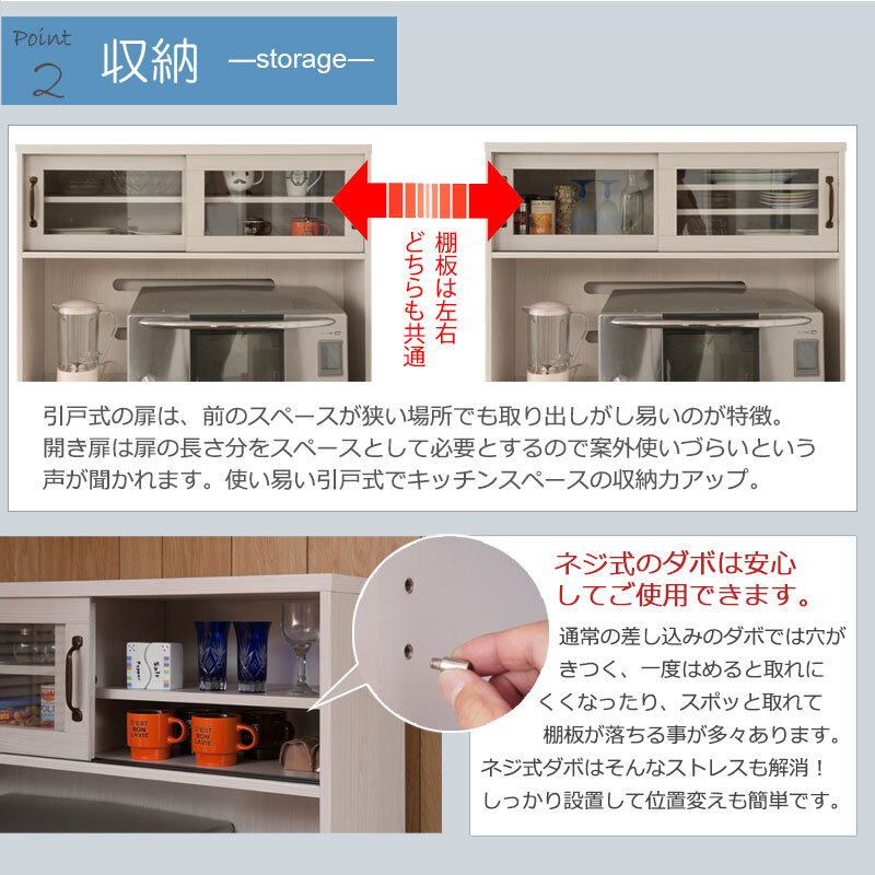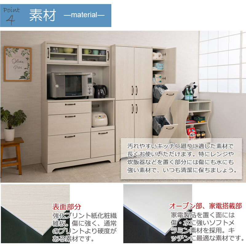 ■商品の仕様/本体:強化プリント紙化粧繊維板、カウンター天板・スライド棚:ソフトメラミン化粧繊維板、扉枠内:強化ガラス